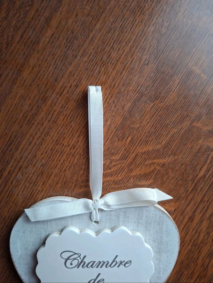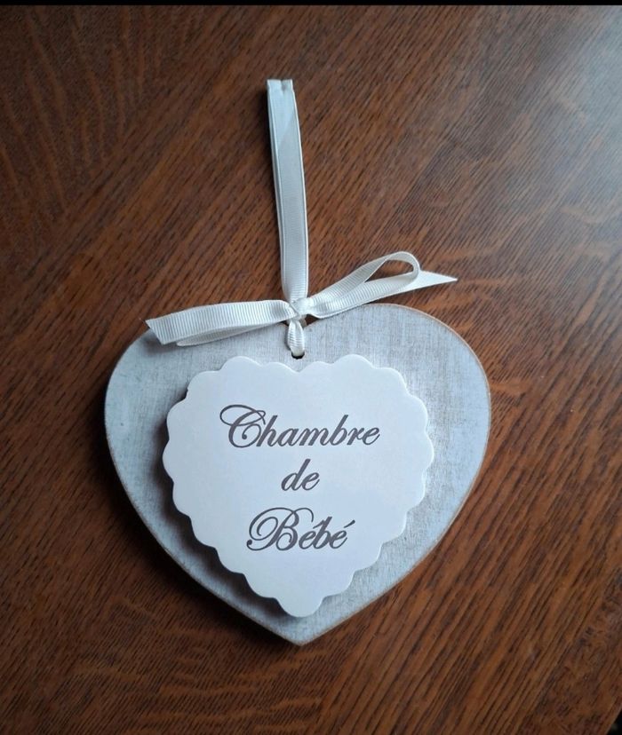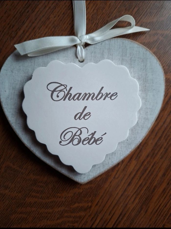 Jolie plaque décorative en forme de cœur avec inscription “Chambre de Bébé”. Couleur douce gris clair / blanc, style tendre et cosy 🤍 Parfaite pour décorer une chambre de bébé, une porte ou un mur. Ambiance chaleureuse, idéale pour une déco naissance. Elle est en parfait état. Elle etait accrochée avec une pointe par le noeud. 🚭Famille non-fumeur