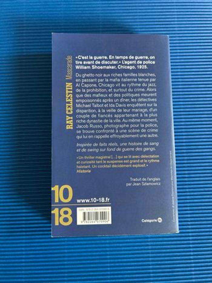 Je vends ce livre en excellent état Titre : Mascarade Auteur : Ray Celestin Date de publication : 01/02/2018 Éditeur : 10-18 Thème : Littérature moderne et contemporaine, Romans, Policiers Format: Poche 614 pages Hauteur : 18 cm Largeur : 11 cm Epaisseur : 2 cm Résumé Mascarade « C'est la guerre. En temps de guerre, on tire avant de discuter. » L'agent de police William Shoemaker, Chicago, 1925. Du ghetto noir aux riches familles blanches, en passant par la mafia italienne tenue par Al Capone, Chicago vit au rythme du jazz, de la prohibition, et surtout du crime. Alors que des mafieux et des politiques meurent empoisonnés après un diner, les détectives Michael Talbot et Ida Davis enquêtent sur la disparition, à la veille de leur mariage, d'un couple de fiancés appartenant à la plus riche dynastie de la ville. Au même moment, Jacob Russo, photographe pour la police, se trouve confronté à une scène de crime qui lui en rappelle effroyablement une autre. Inspirée de faits réels, une histoire de sang et de swing sur fond de guerre des gangs. Envoi rapide et très soigné