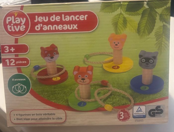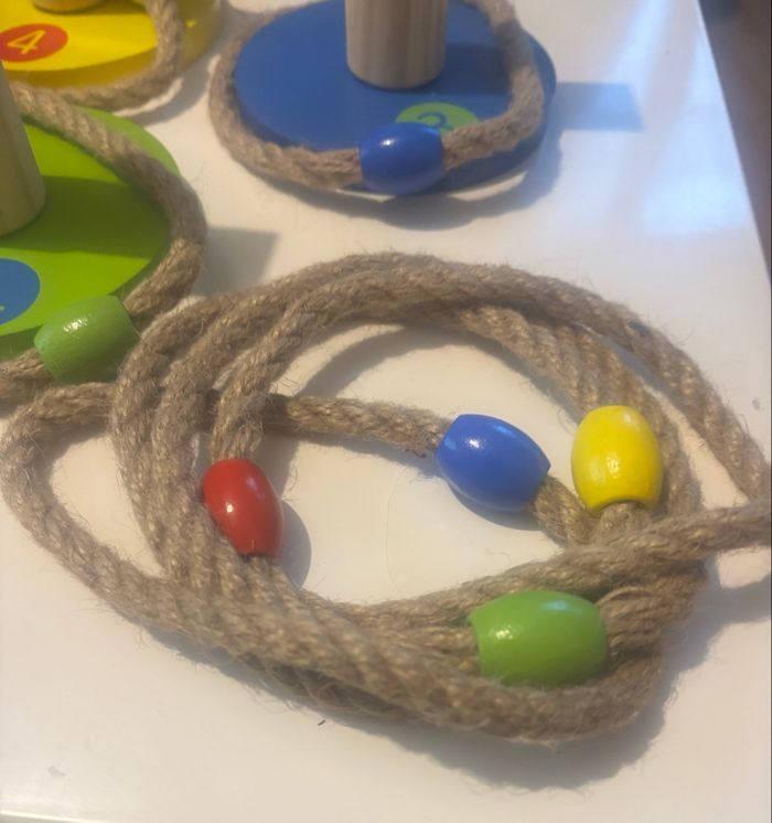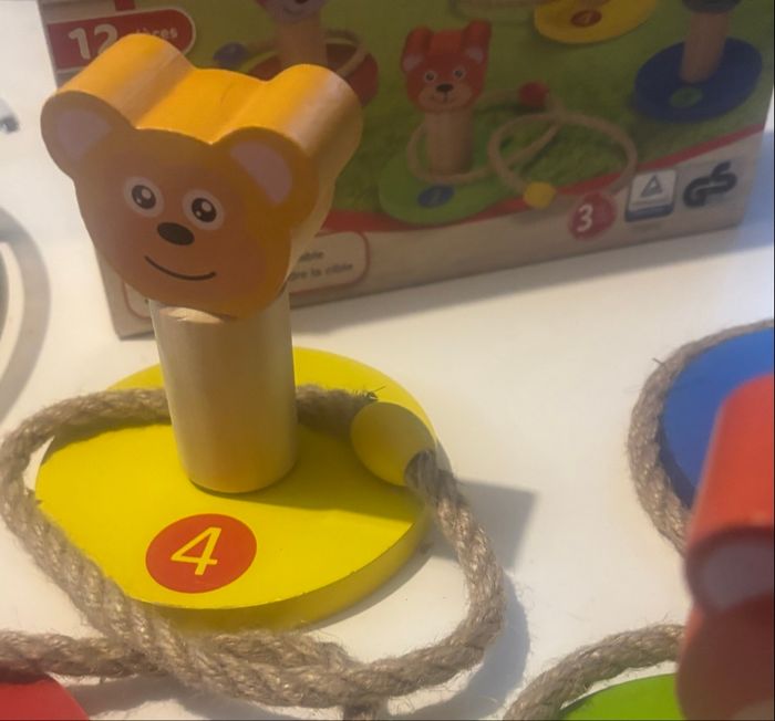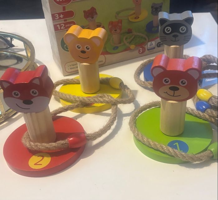 vends ce jeu de corde Montessori avec 4 figurines en bois. - Type de produit : Jouets en bois - Âge recommandé : De 4 à 6 ans - Composition du lot : 4 figurines en bois (chat, ours, lapin, chien), 4 anneaux de lancer Très bon état. Un jeu éducatif et amusant pour les enfants ! N'hésitez pas à me contacter pour plus d'informations.