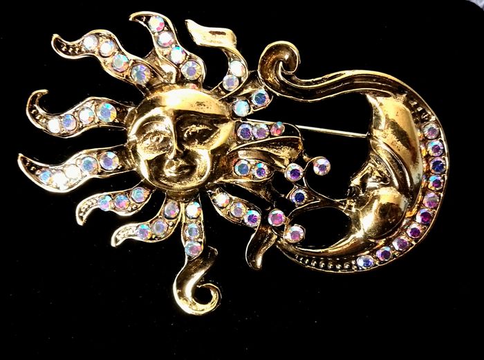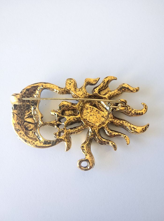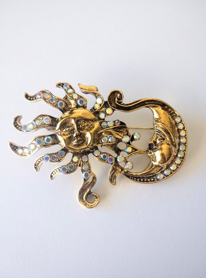 Broche celtique. Broche : soleil, croissant lune, strass. (celtique, bohème, boho-chic, spirituel, élégant, idéal cadeau) DESCRIPTIF : Magnifique broche soleil, lune. Couleur : doré. Dimension : 6,5 cm L * 4 cm H Envoi rapide et soigné.