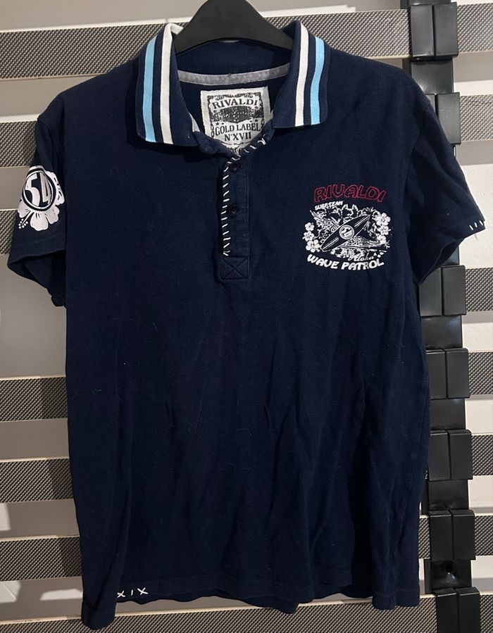 Je vends un polo, de la marque « Rivaldi », taille L - Dimensions: Longueur 61 cm - Largeur 40 cm - Matière: 100% Coton - Couleurs: Marine, Bleu & Blanc En très bon état 9,99€