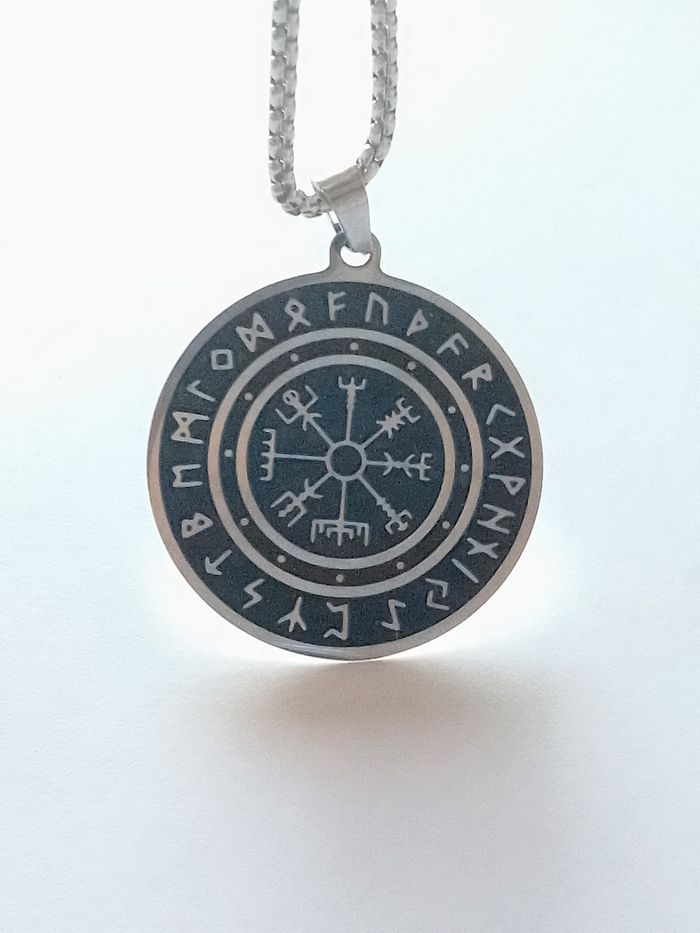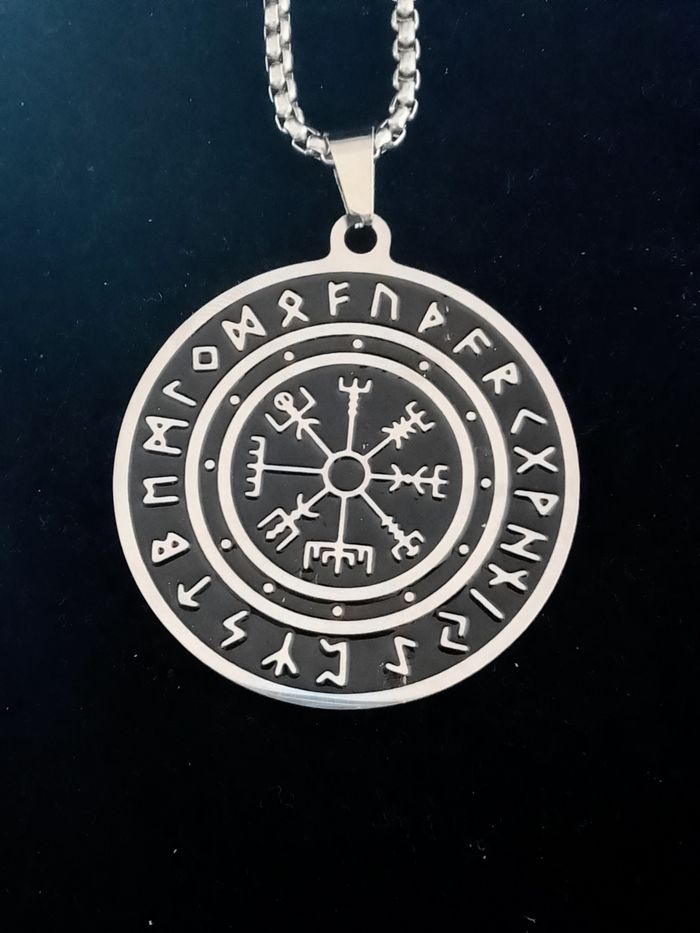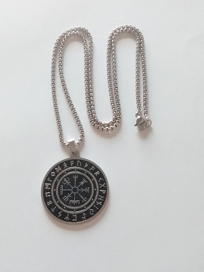Chaîne + pendentif viking. Motif : boussole viking, runes. (viking, celtique, protection, idéal cadeau) DESCRIPTIF : Couleur : noir, argenté. Taille chaîne : 60 cm Diamètre pendentif : 3,5 cm L * 3,8 cm H. Envoi rapide et soigné.