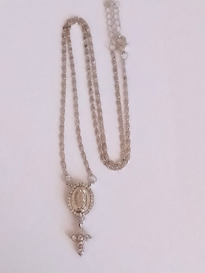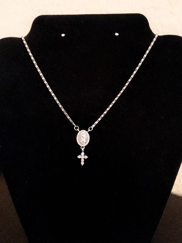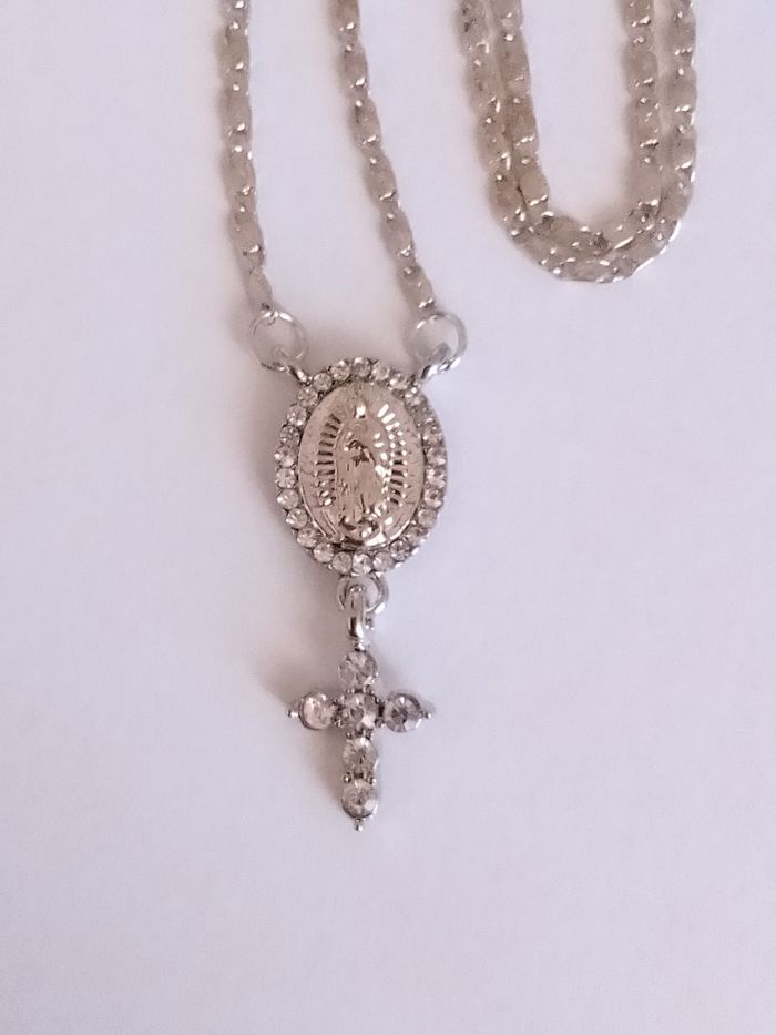 Chaîne + pendentif religieux. Pendentif : vierge marie, croix, strass. (religieux, protection, spirituel, élégant, idéal cadeau) DESCRIPTIF : Couleur : argenté. Taille chaîne : 45 cm + 5 cm Diamètre pendentif : 3 cm H Envoi rapide et soigné.