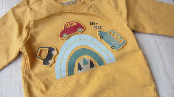 Tee shirt de coloris moutarde. Voitures en surimpression. Marque Orchestra. Taille 3 mois.