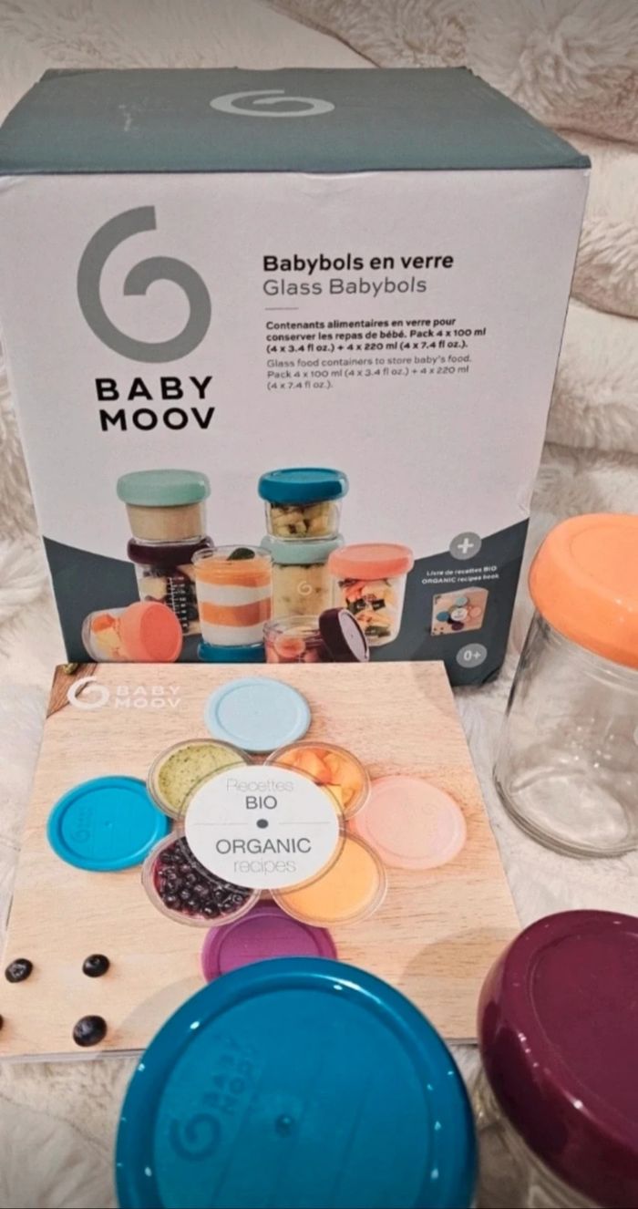 Coffret repas bébé comprenant 8 pots en verre Babybols babymoov. ☆ 4 pots de 60ml->100ml ☆ 4 pots de 160ml->220ml ☆ Livret de recette. ☆ Excellent état. ☆ Graduations intactes. ☆ Joints présents.