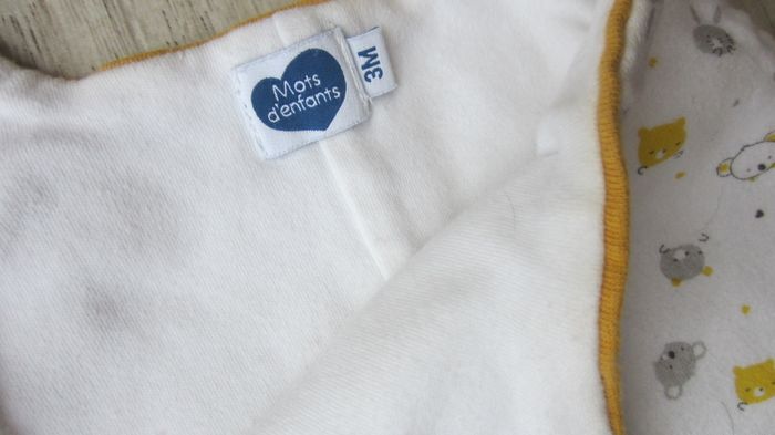 Combishort. S'ouvre entierement a l'entrejambe. Boutons pour le haut. Marque : Mots d'enfants. Taille 3 mois.