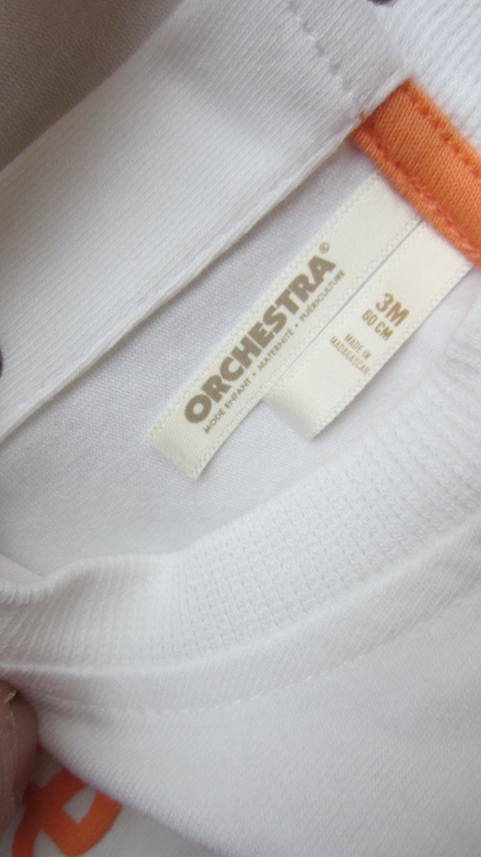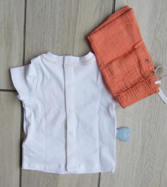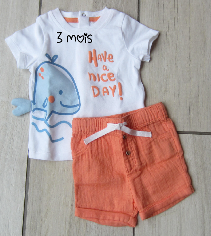 Ensemble short et tee shirt sur le theme "baleine". Le tee shirt s'ouvre entierement dans le dos. Marque Orchestra. Taille 3 mois.