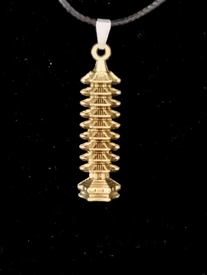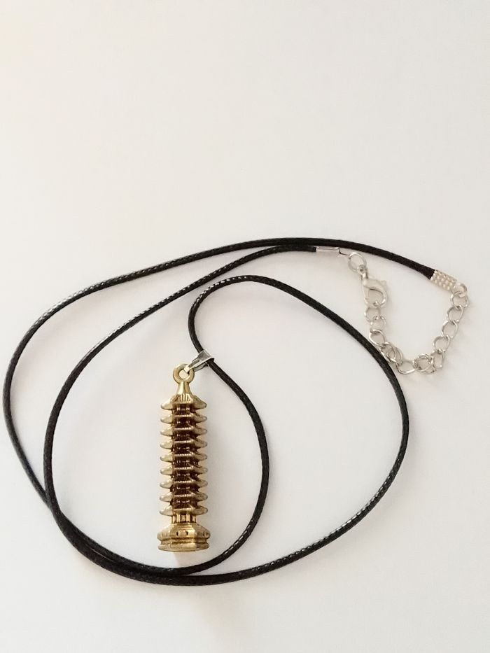 Collier corde de cire + pendentif chinois. Pendentif : tour de wenchang à 9 étages en laiton. (chinois, idéal cadeau) DESCRIPTIF : Couleur : doré. Taille chaîne : 55 cm + 5 cm Diamètre pendentif : 4 cm H Envoi rapide et soigné.