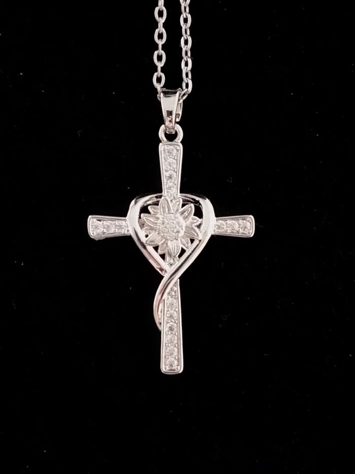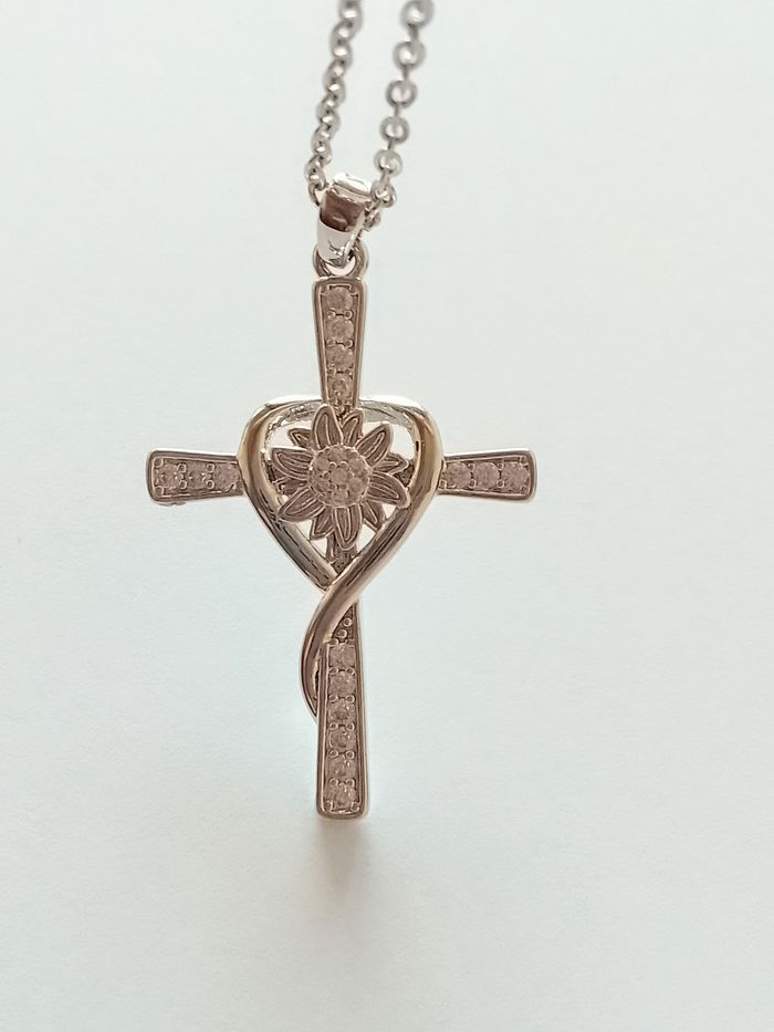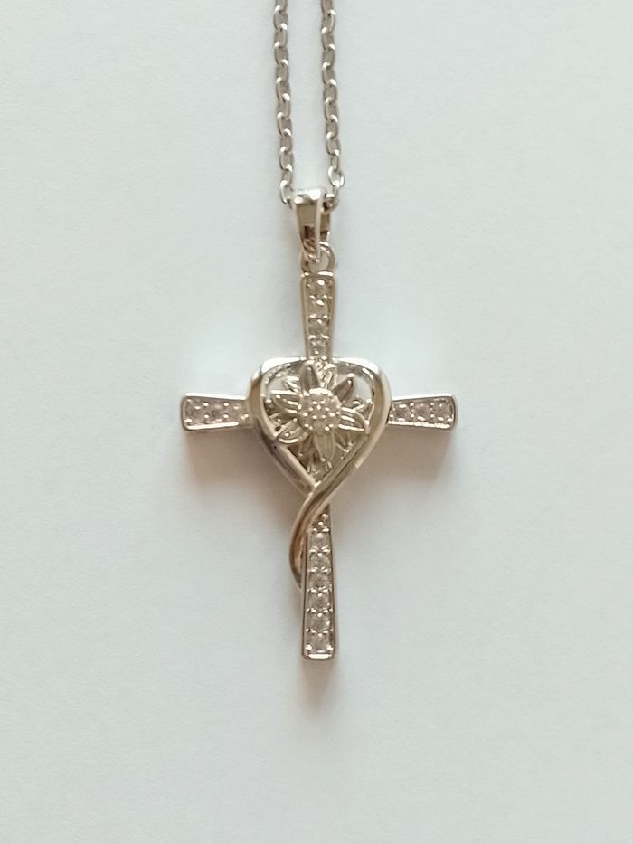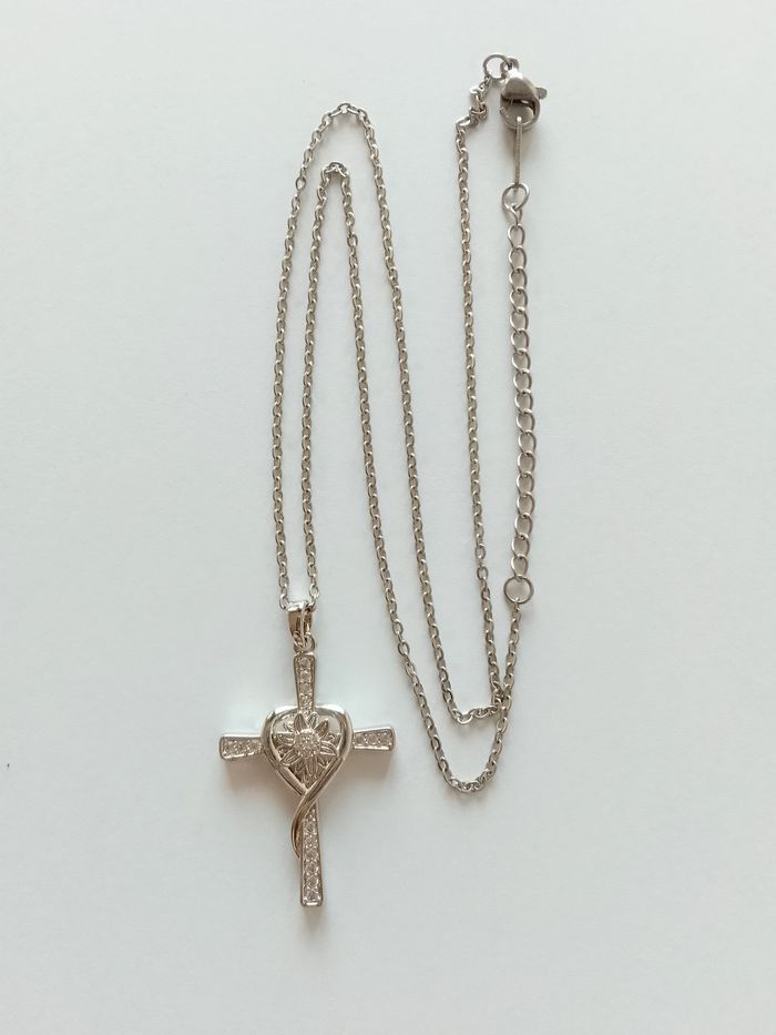 Chaîne + pendentif religieux. Pendentif : croix, coeur, strass. (élégant, religieux, protection, spirituel, bohème, idéal cadeau) DESCRIPTIF : Couleur : argenté. Taille chaîne : 45 cm + 5 cm Diamètre pendentif : 2,2 cm L * 3,5 cm H Envoi rapide et soigné.