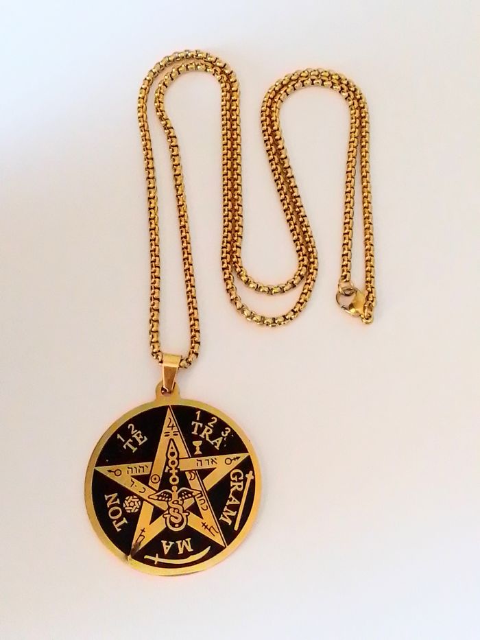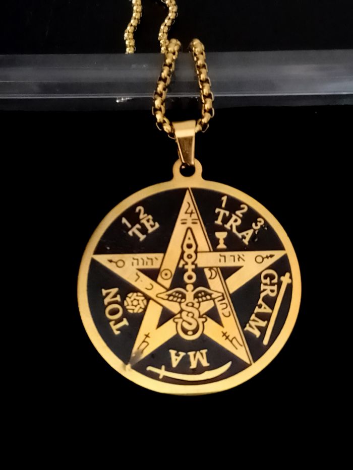 Chaîne + pendentif celtique. Motif : pentagramme. (celtique, protection, spirituel, idéal cadeau) DESCRIPTIF : Couleur : noir, doré. Taille chaîne : 60 cm Diamètre pendentif : 3,7 cm L * 4 cm H Envoi rapide et soigné.