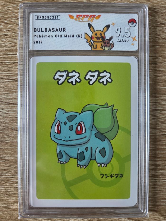 Je vends cette carte Pokémon japonaise Babanuki Bulbizarre, une édition limitée et gradée par SGCH avec la note de 9,5. - Type de produit : Carte de collection Pokémon - Personnage : Babanuki (Bulbizarre) - Édition : Japonaise - Certification : Gradée SGCH, note 9,5 MINT. Pokémon Babanuki (japonais : ポケモンババ抜き Pokemon Baba-nuki) est un jeu de cartes publié par The Pokémon Company, et publié exclusivement dans les magasins Pokémon Center au Japon, basé sur le jeu de cartes victorien Old Maid. Sorti pour la première fois en mai 2019.