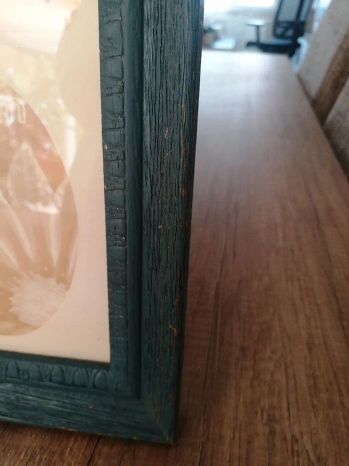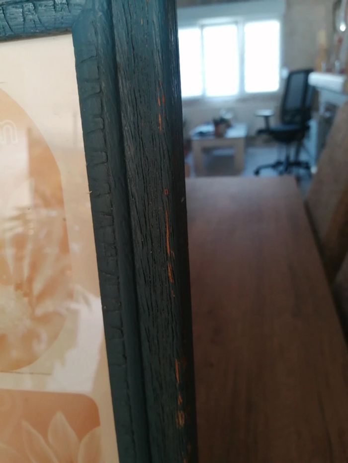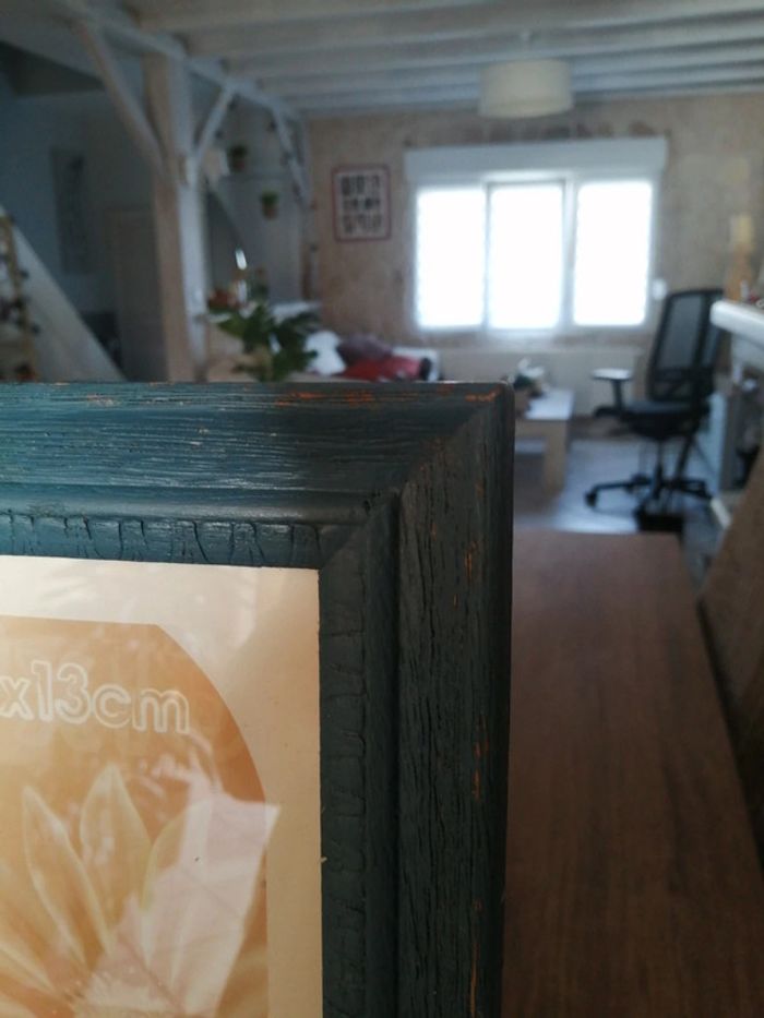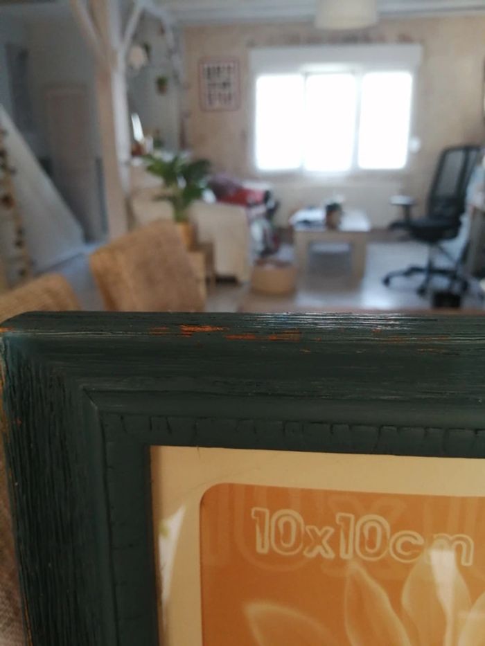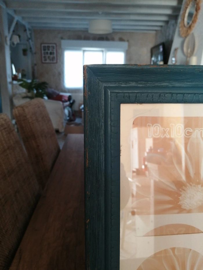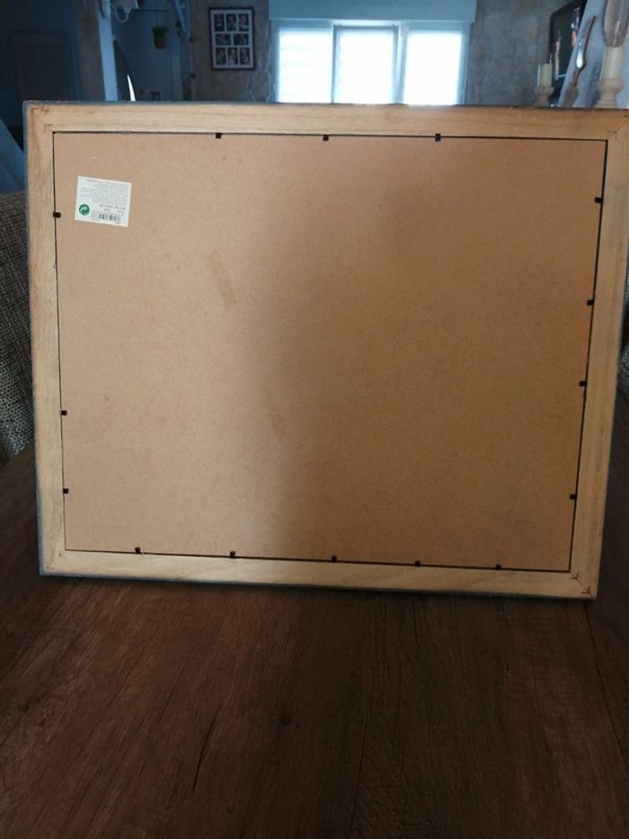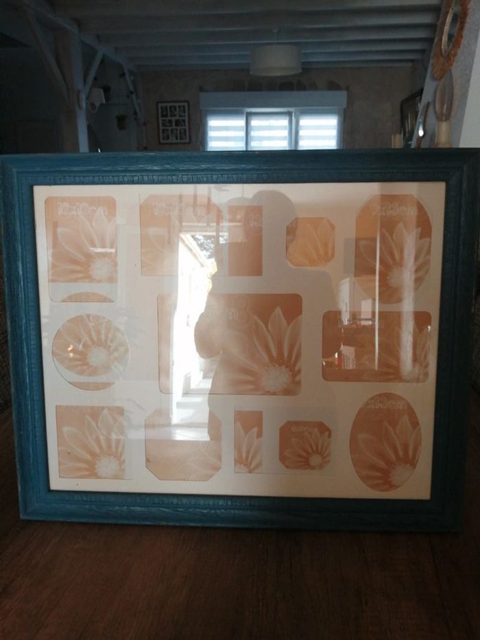 Cadre pèle mêle avec un encadrement en bois. La peinture est retiré à certains endroits. Le papier que vous voyez avec les mesures des0 photos est légèrement déchiré à certains endroits parque j avais collée des photos dessus mais ça ne gêne pas et ça ne se verra pas quand il y aura les photos dessus