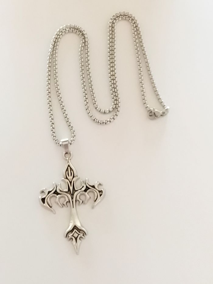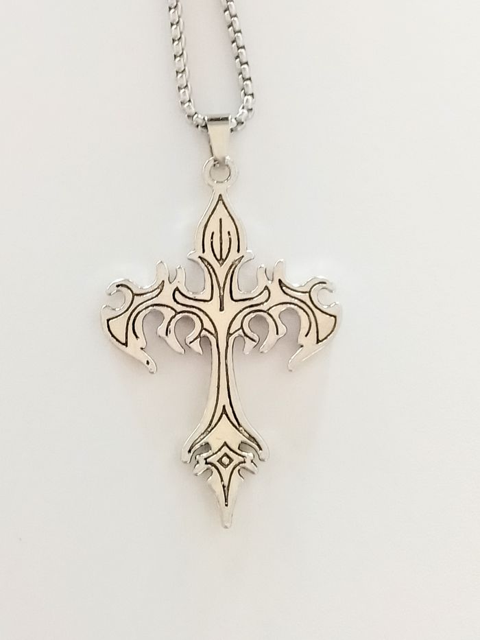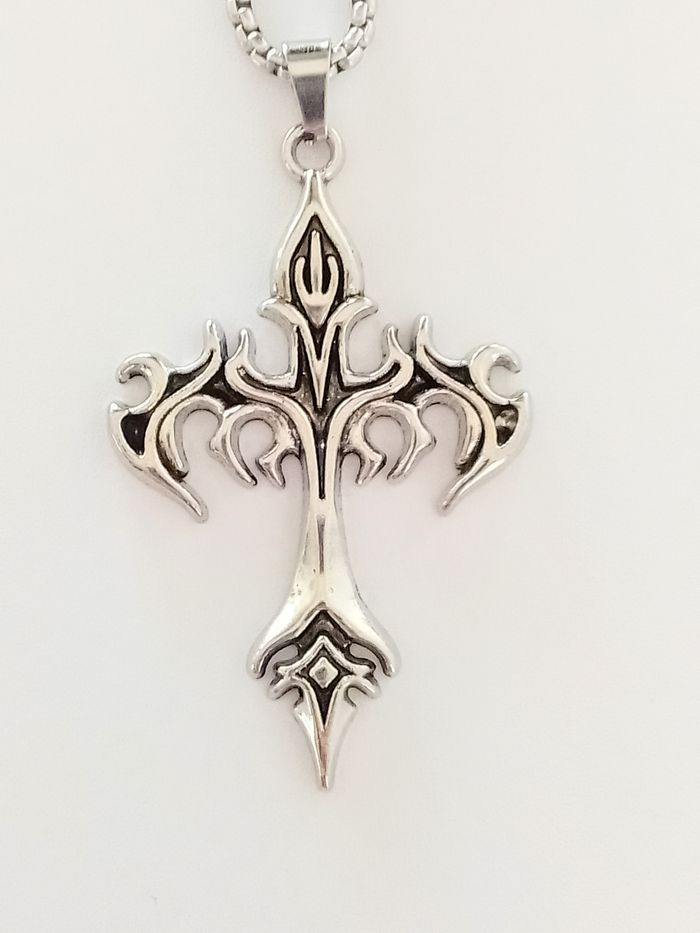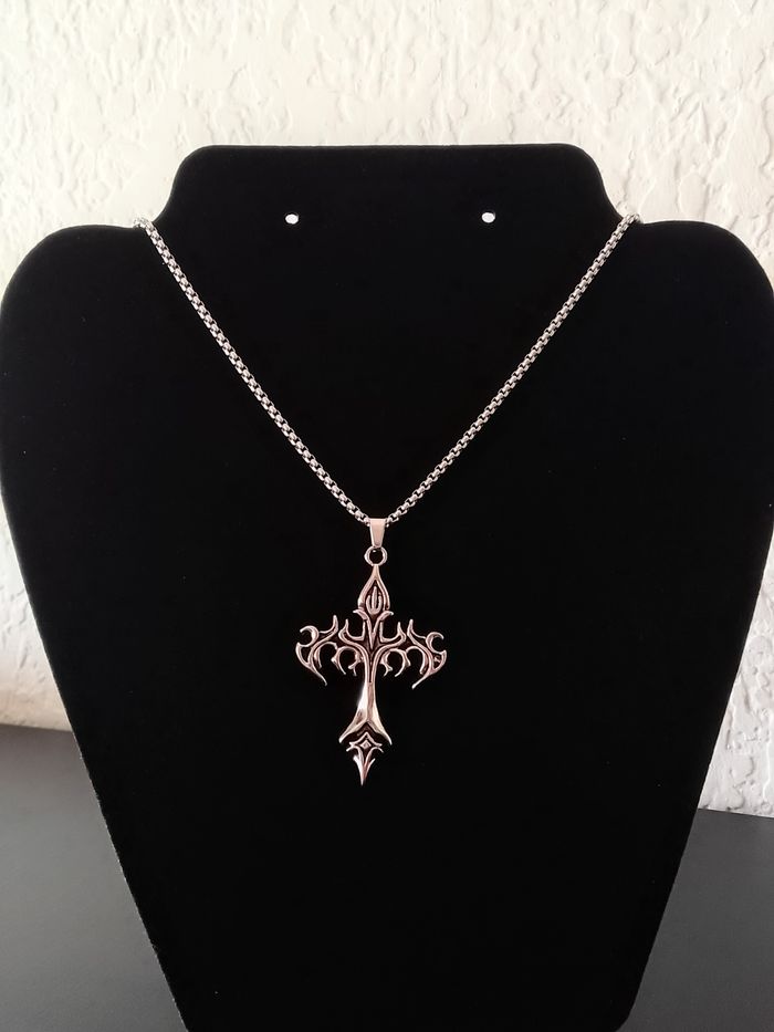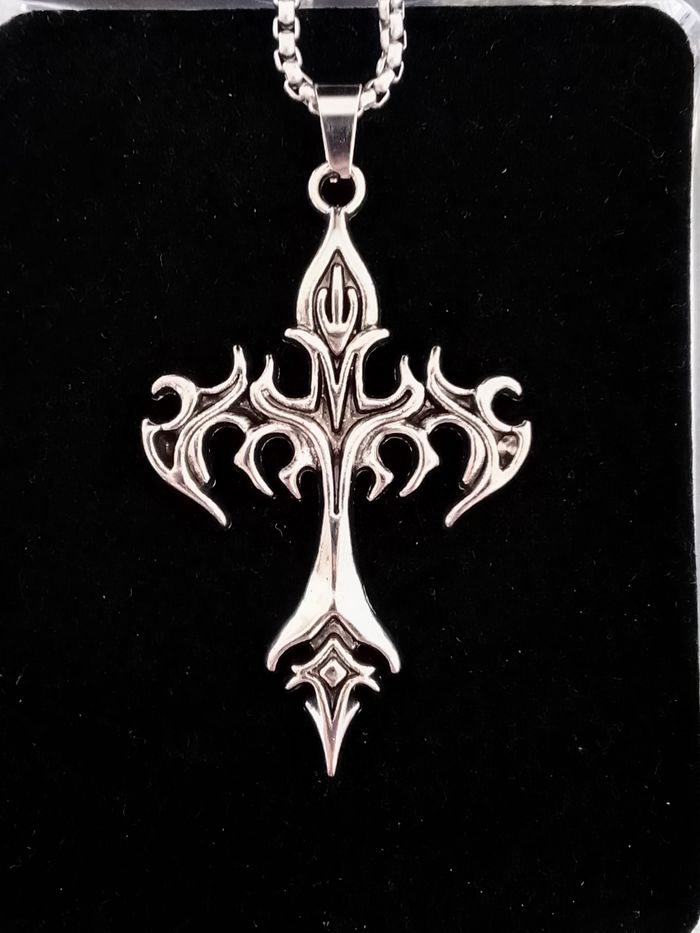 Chaîne + pendentif gothique. Pendentif : croix gothique. (gothique, religieux, protection, spirituel, celtique, idéal cadeau) DESCRIPTIF : Pendentif double face. Couleur : argenté. Taille chaîne : 60 cm Diamètre pendentif : 3,5 cm L * 5,5 cm H Envoi rapide et soigné.