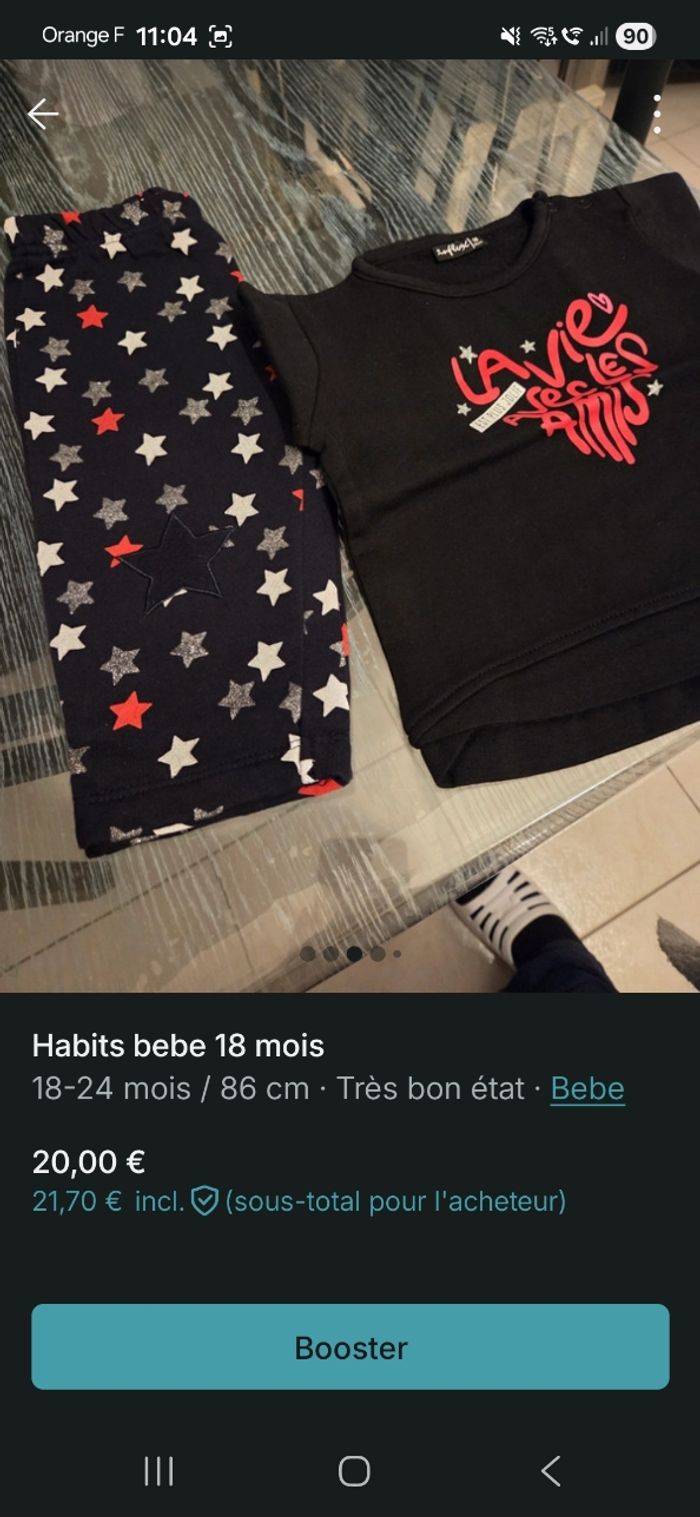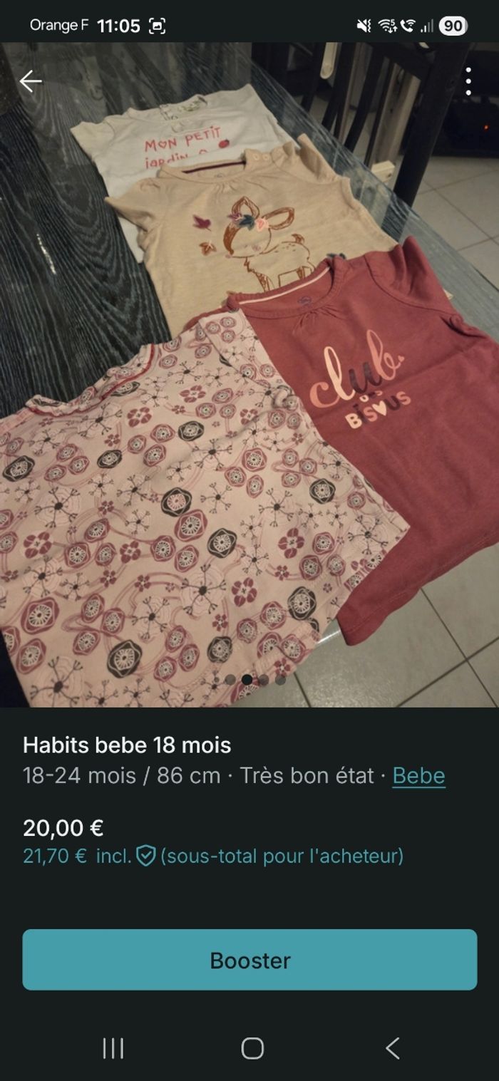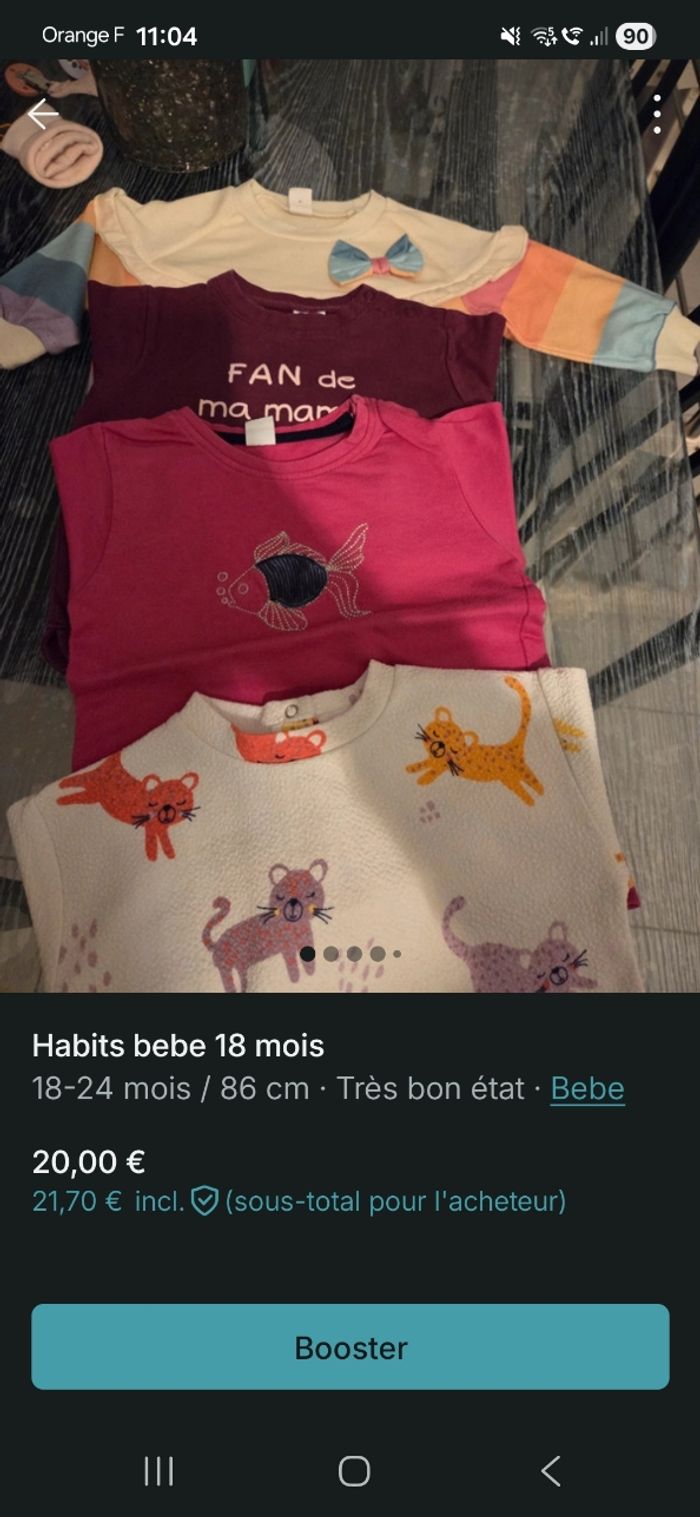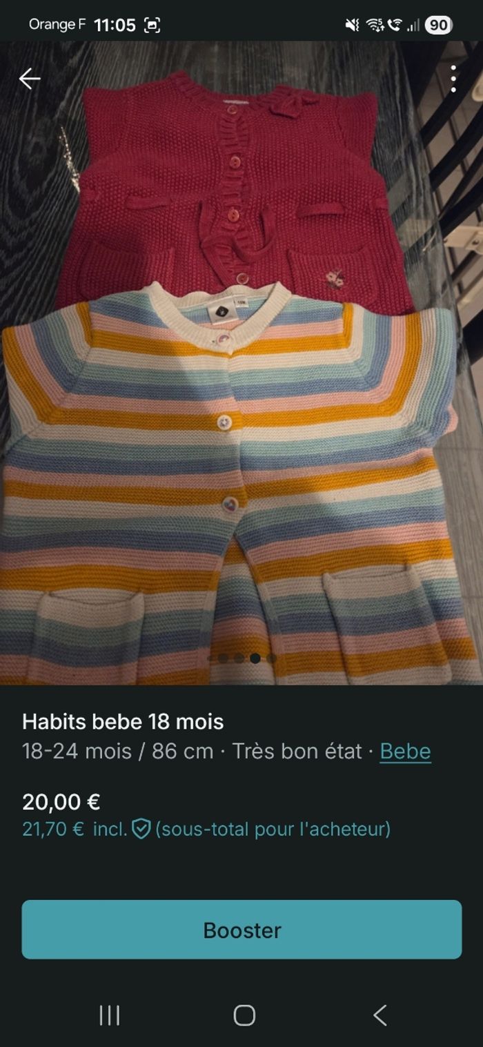 Habits bebe fille en bon etat sans taches ni trou. Maison non fumeur et sans animaux. 7 pantalons 1 robe ete 2 gilets 4 pulls 1 jogging 4 tee short manche longue