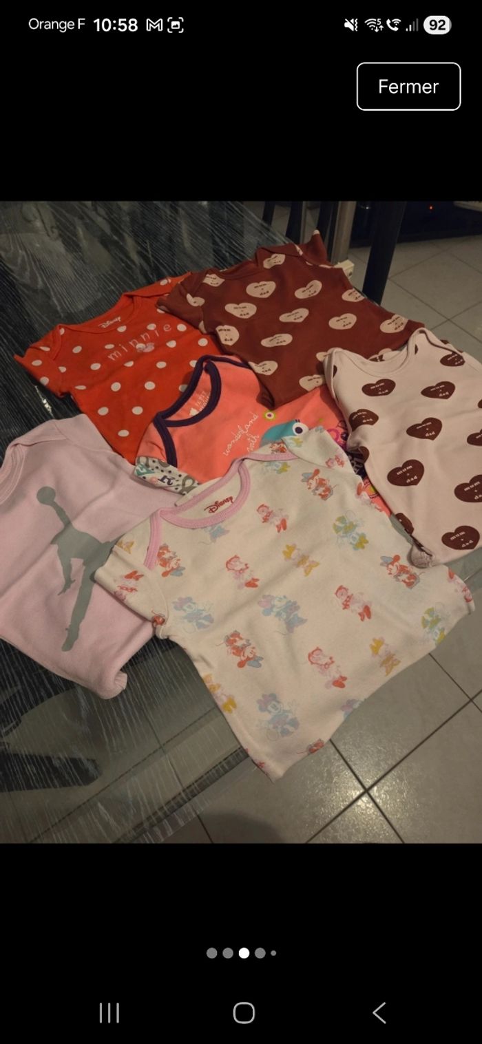 6 boddies bebe fille en tres bon etat sans trou ni taches. Maison non fumeur et sans animaux