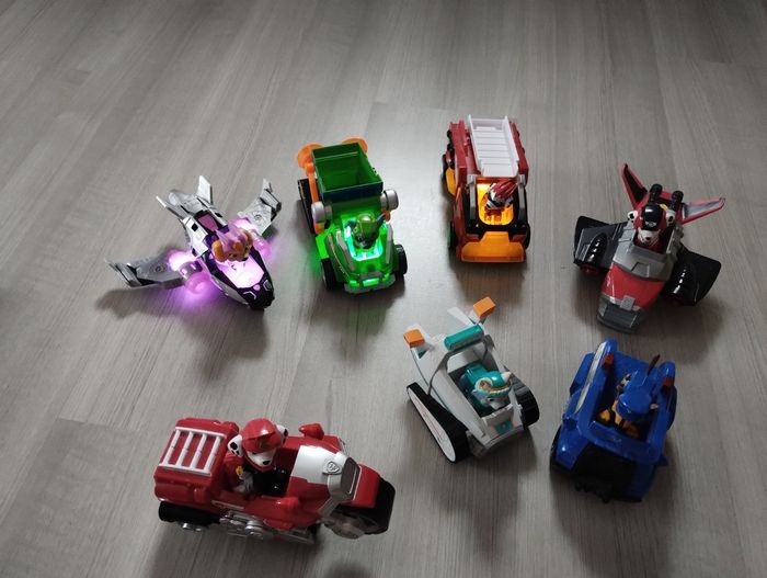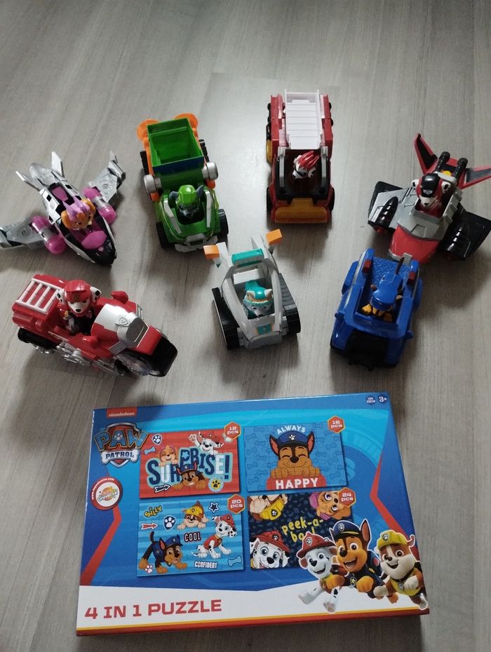 Lot de véhicules pat patrouille Je donne une boîte de puzzles avec (présente qq défauts mais n'empêche pas de les faire) Le tout acheté neuf