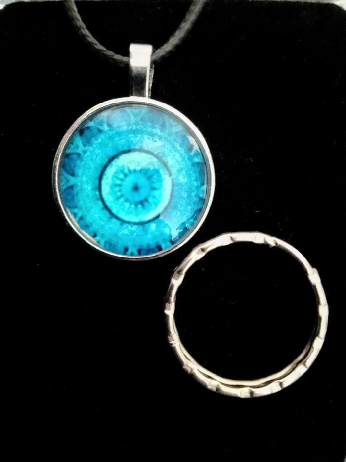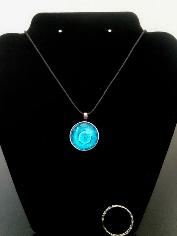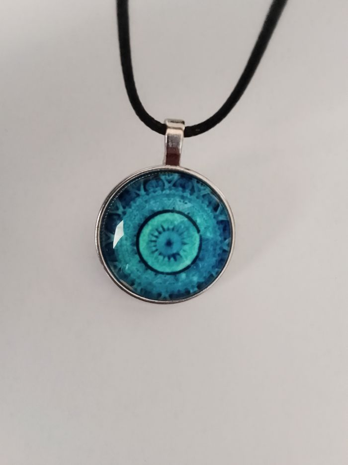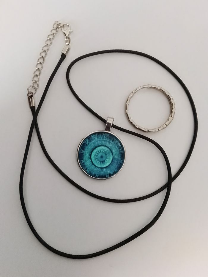 Collier corde de cire + pendentif mandala. Pendentif : mandala en verre cabochon + anneau porte-clés. (protection, spirituel, celtique, porte-bonheur, bohème, idéal cadeau) DESCRIPTIF : Couleur : bleu, argenté. Taille chaîne : 57 cm + 5 cm. Diamètre pendentif : 2,8 cm L * 2,8 cm H. Envoi rapide et soigné.