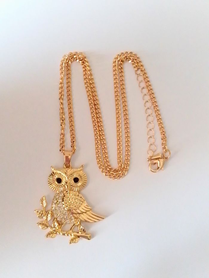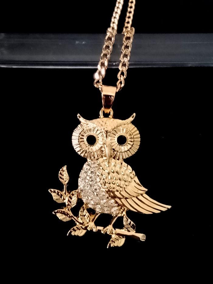 Chaîne + pendentif élégant. Pendentif : hibou, strass. (élégant, bohème, celtique, idéal cadeau) DESCRIPTIF : Couleur : doré, noir. Taille chaîne épaisse : 50 cm + 5 cm Diamètre pendentif : 3,7 cm L * 4 cm H Envoi rapide et soigné.