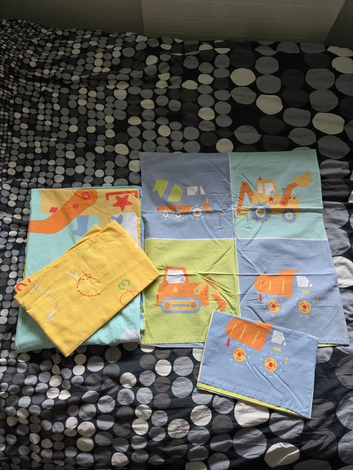 Vends parure de draps enfant thème véhicules de travaux : - housse de couette - drap housse - 2 taies d'oreiller 63x63 cm Tbe 15€