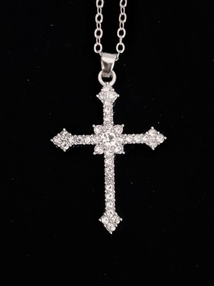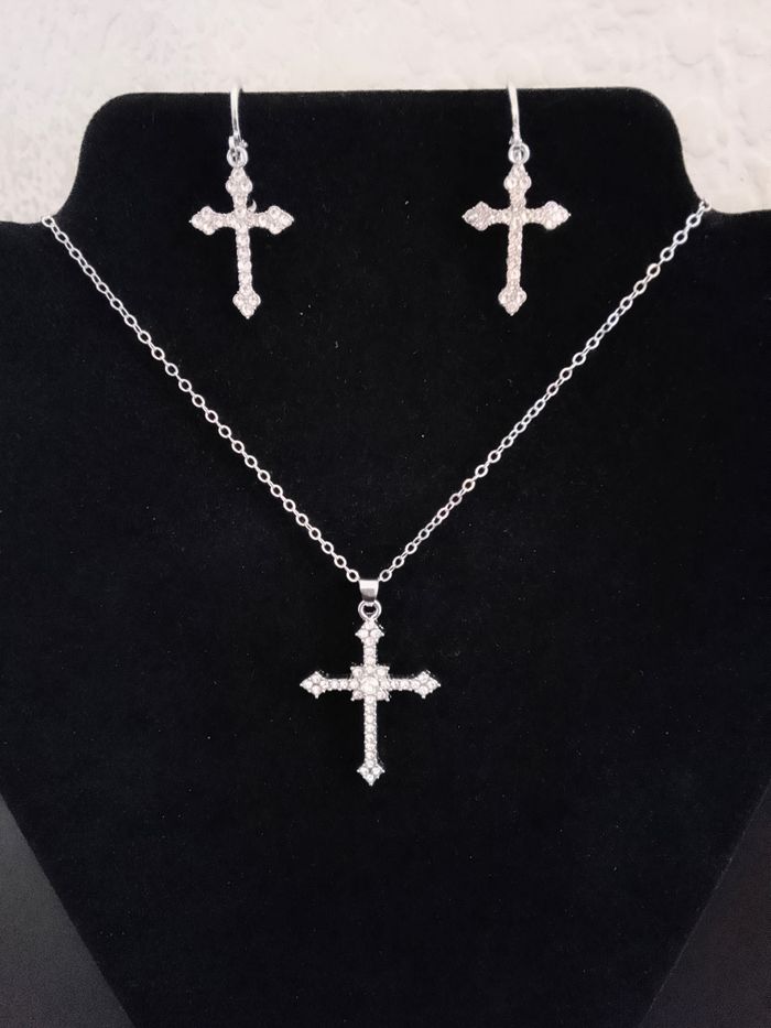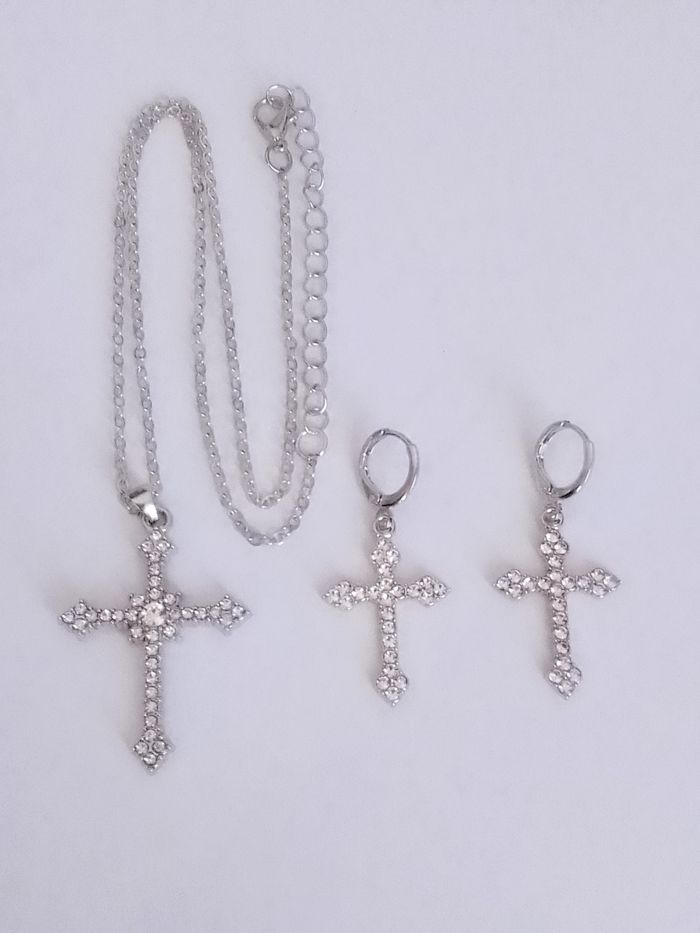 Parure religieuse. Parure : chaîne, pendentif + boucles d'oreilles, croix, strass. (religieux, protection, spirituel, celtique, élégant, idéal cadeau) DESCRIPTIF : Couleur : argenté. Taille chaîne : 41 cm + 8 cm Diamètre pendentif : 2,5 cm L * 4 cm H Diamètre boucles d’oreilles : 3 cm H Envoi rapide et soigné.