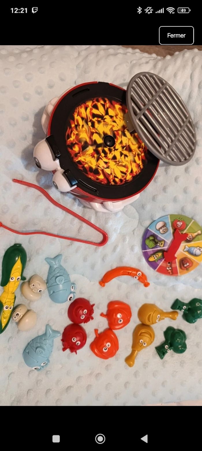 Barbecue party Très bon état / manque une saucisse mais ne gêne en rien son utilisation / sans la boîte But du jeu : lance la roulette, place le délicatement sur la grille, si tu tombes a nouveau sur le même aliment tu le récupères Gare a ne pas avoir la main trop lourde en le retirant de la grille , sinon elle explose