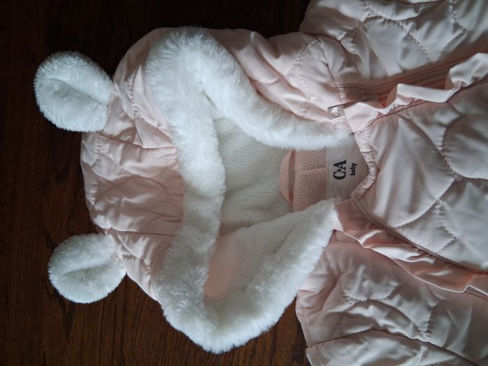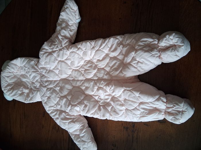 Combipilote matelassée rose clair de marque C&A Couleur : extérieur et intérieur rose ; intérieur du capuchon blanc Composition : 100 % polyester Taille : 62 cm (2-3 mois) Lavage à 40°, séchoir en machine interdit Très peu portée