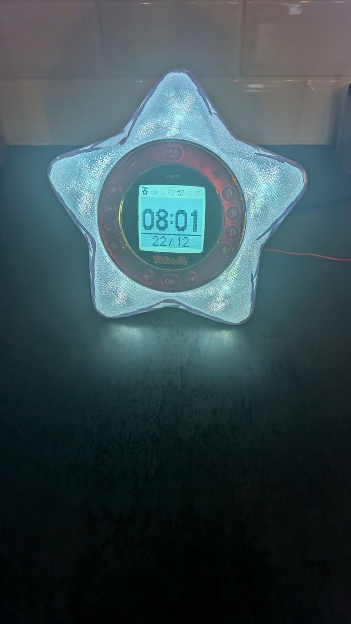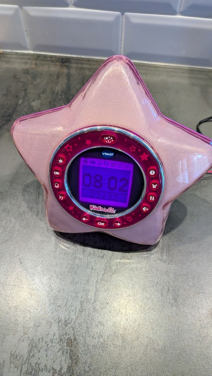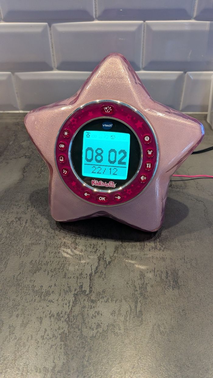 Reveil KidiMagic En bon état Fonctionne parfaitement VERSION : Française ÂGE : de 6 à 12 ans, un réveil magique en forme d’étoile qui change de couleur avec projection animée au plafond DÉTECTION DE MOUVEMENT : Il suffit de passer la main au-dessus de l’étoile pour la voir changer de couleur comme par magie ! La couleur de l’étoile varie grâce aux effets de lumières douces et magiques PROJECTION ANIMÉE : Magique ! Grâce à la projection animée, votre enfant découvre l’heure entourée d’étoiles scintillantes ou de fleurs ENCEINTE : l’enfant peut brancher son MP3 grâce au câble inclus INCLUS : 7 variations de couleurs / 12 effets lumineux / Fonction horloge parlante, réveil et radio / 8 jeux / 6 mélodies et des sons de la nature relaxants / Écran rétroéclairé avec plus de 10 thèmes pour personnaliser son écran / Fonctionne avec 4 piles LR6 fournies ou adaptateur secteur non fourni
