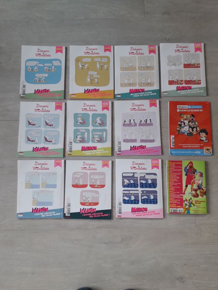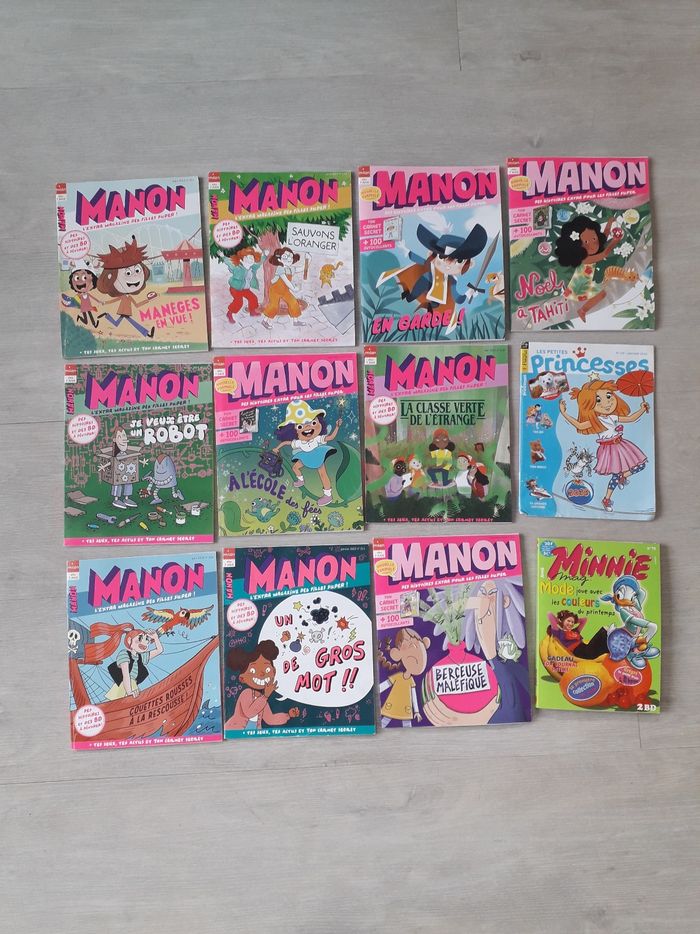 Lot de 12 magazines 7-10 ans : - 10 MANON n°211-212-213-214-215-216-218-219-220-221 dont 3 neufs jamais lus, les autres sont en très bon état. Aucun jeu, ni aucune gommettes n'a été collé sur les 10 magazines. Je donne : - les petites princesses n°215 en bon état, les jeux n'ont pas été faits - Minnie mag n°70 en très bon état