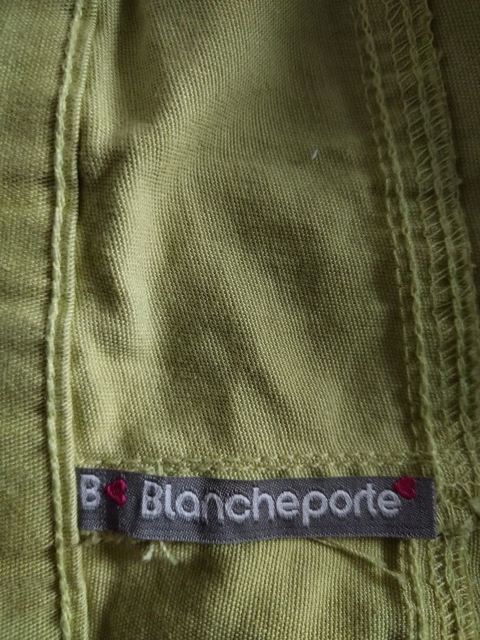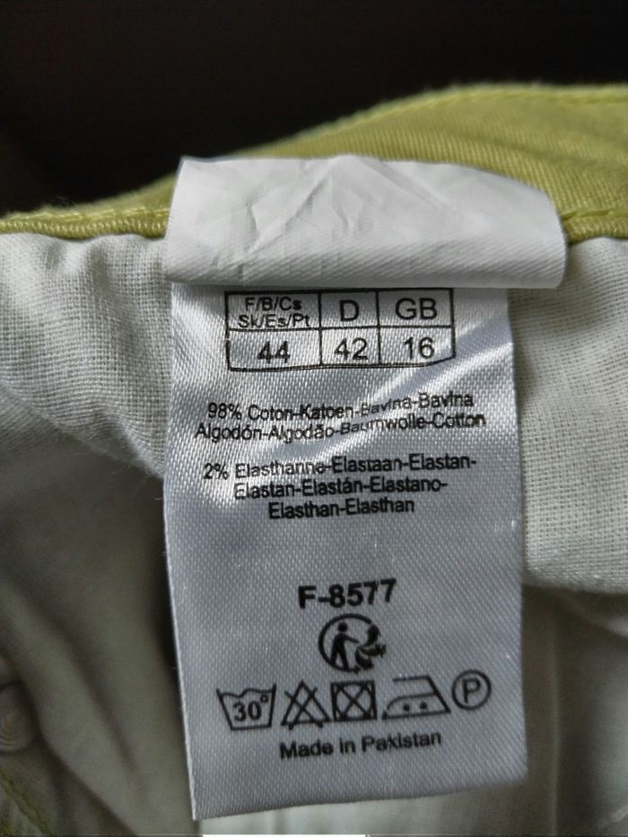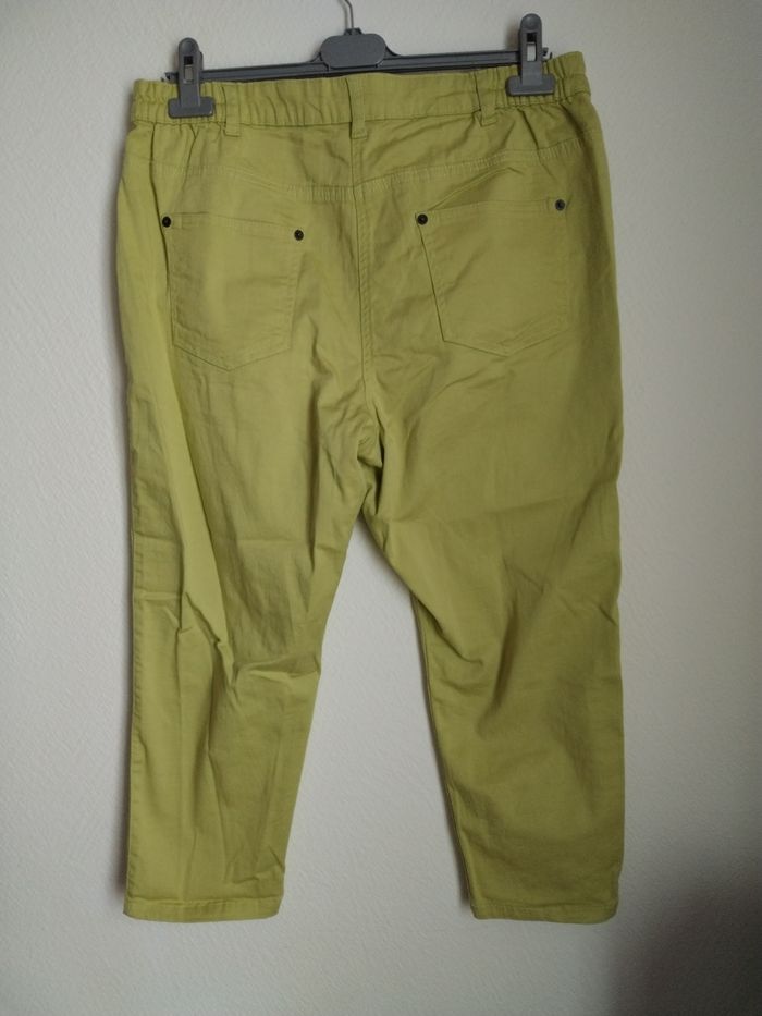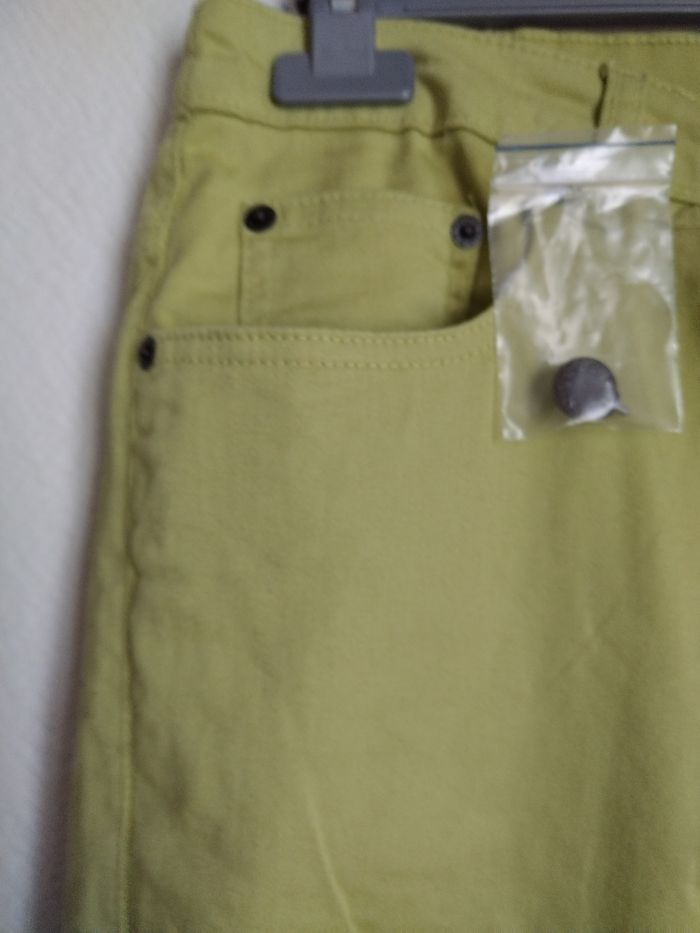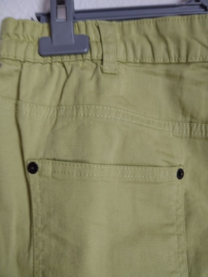 Pantacourt vert anis Poches devant et 2 poches plaquées arrières Arrière 10 cm élastique des 2 côtés Fermeture par tirette et un bouton + un bouton de rechange Passants 98 % coton 2 % élasthanne Taille 44 Jamais portée