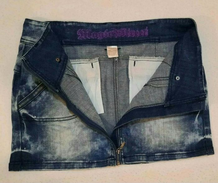 Mini jupe en jean délavé, zippée de haut en bas. Poches zippées à l'avant et strass aux poches arrières. En parfait état. Marque : Magic Street (LA Redoute)