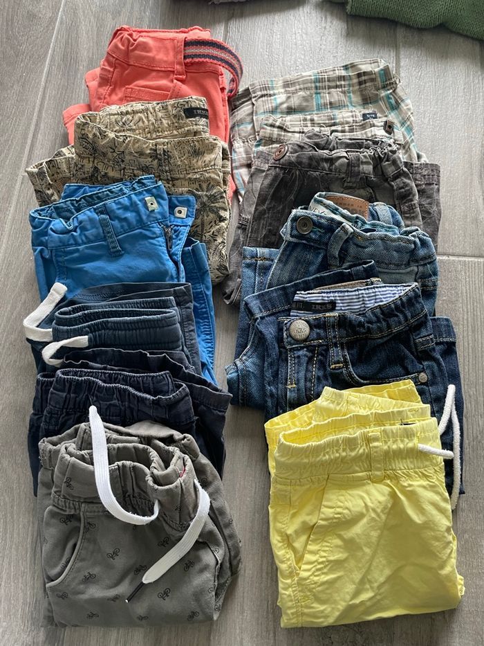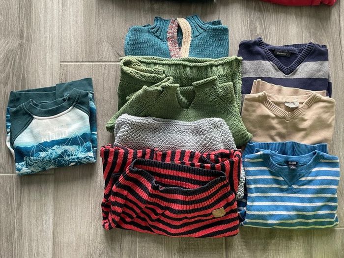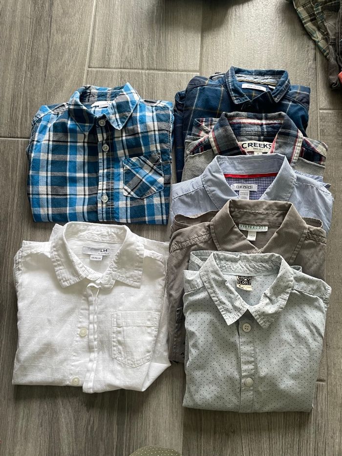 Lot vêtement garçon 6 ans: 10 pantalons 2 chemises manches courtes 5 chemises manches longues ( 2 chemise ont un point de feutre sur une manche voir photos) 10 shorts/bermudas dont 3 IKKS ( bleu, beige avec palmiers, jeans) 3 pulls fins 4 pulls laine 1 sweat-shirts 1 veste à capuche 5 sweat-shirts à capuche 2 t-shirt manches longues 1 haut de pyjama Je donne avec ce lot 3 jogging, 3 vestes, 1 short légèrement tachés, pour le jardin.