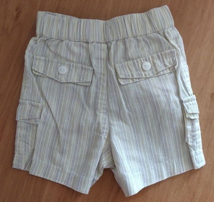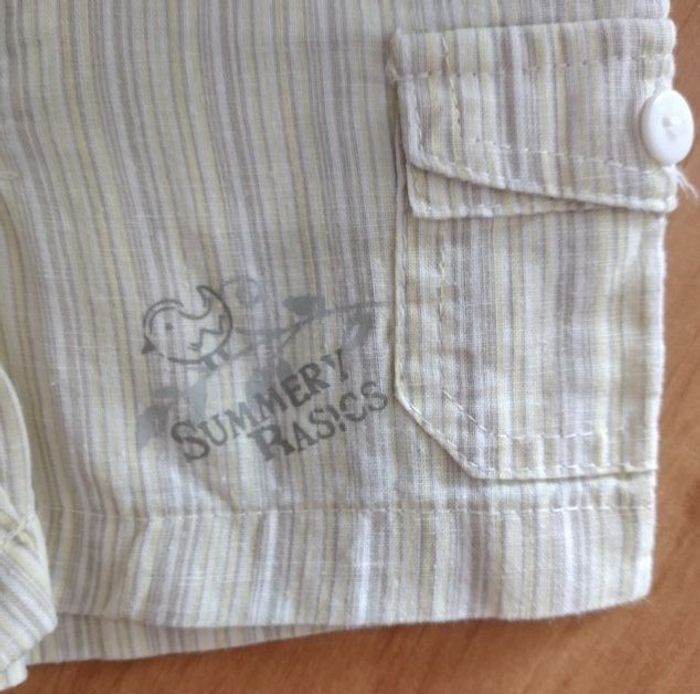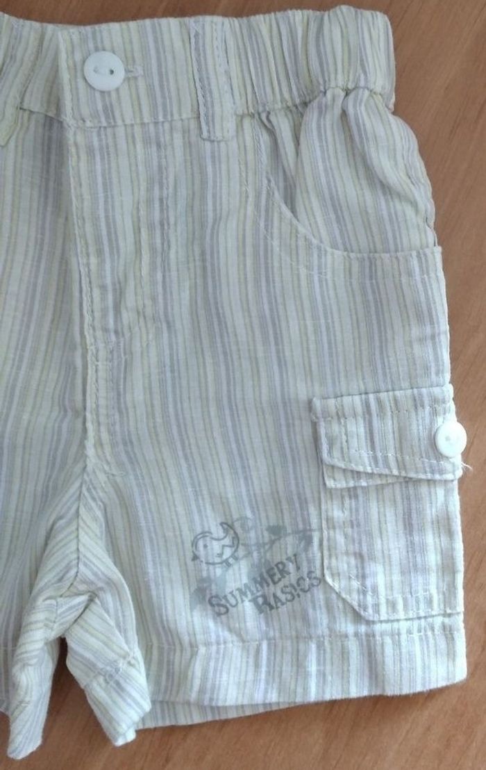 Short 3 mois garçon A rayures grises et moutarde clair Poches devant et un petit motif Imitation poches derrière Marque: Tout simplement
