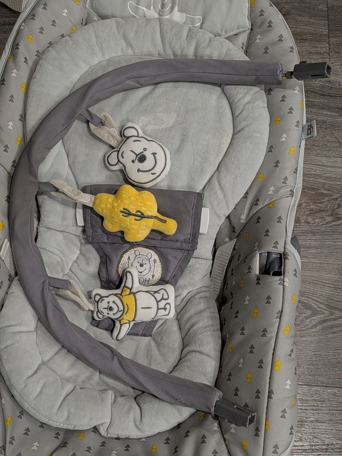 A vendre transat Winnie l'Ourson en l'état. Seul défaut : Les deux côtés de l'arche sont un peu cassés (cf photo). Possible de réparer par quelqu'un de bricoleur.