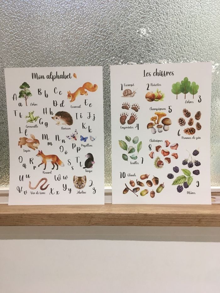 Lot de 2 affiches thème Les animaux de la forêt —> 1 affiche Alphabet —> 1 affiche chiffres Neuves ! Édition limitée d’un imprimeur Bordelais Format A4 D’autres affiches également disponibles dans mon dressing ;)