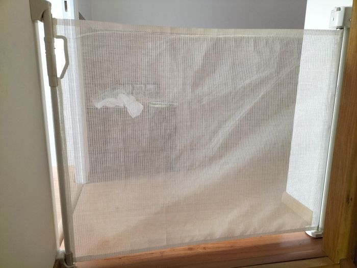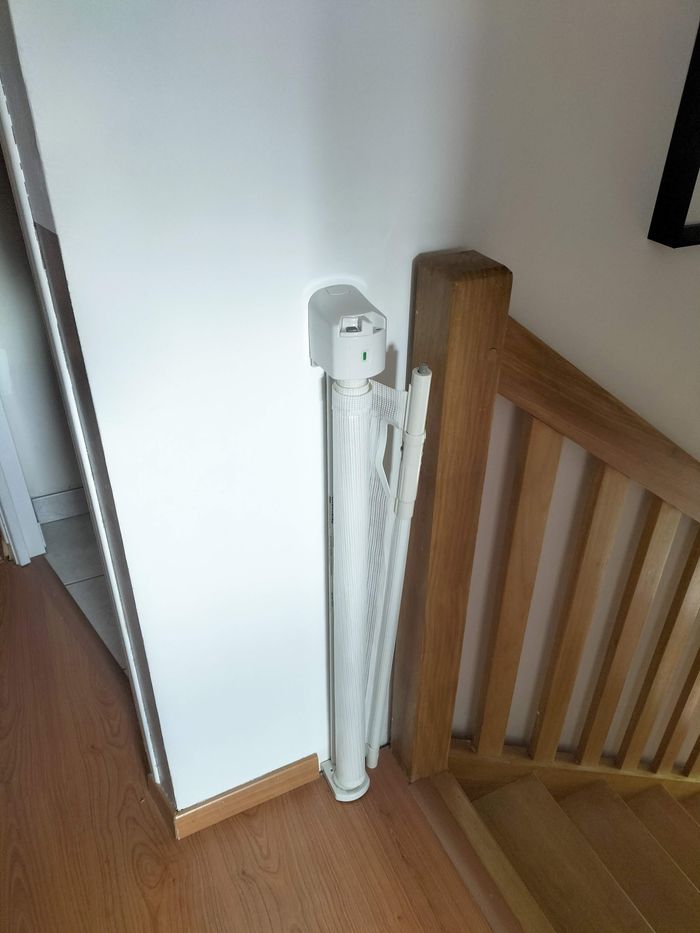 #sécurité #enfant #bébé #barrière rétractable et enroulable. Hauteur : 86 cm / Largeur maximum : 120 cm. Livrée avec notice et gabarit pour percer les trous.