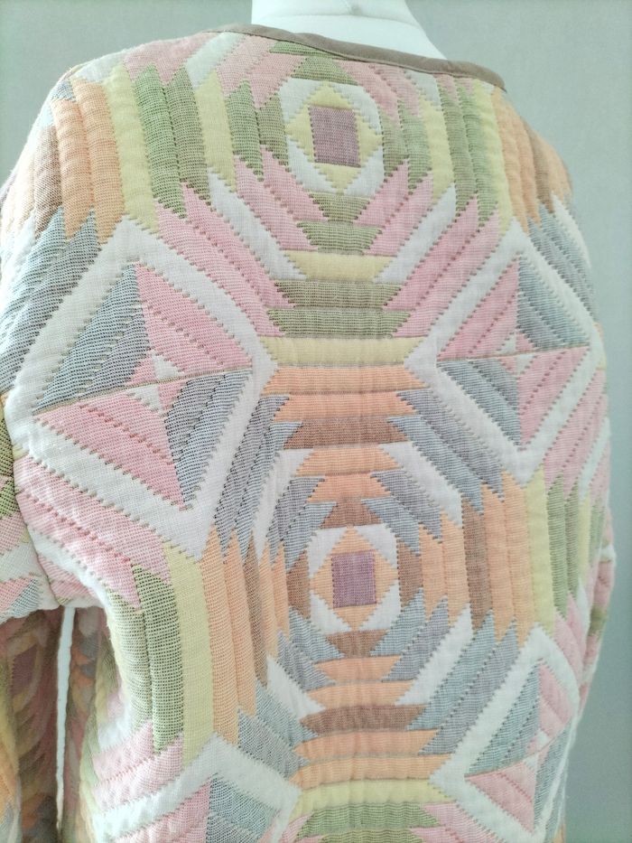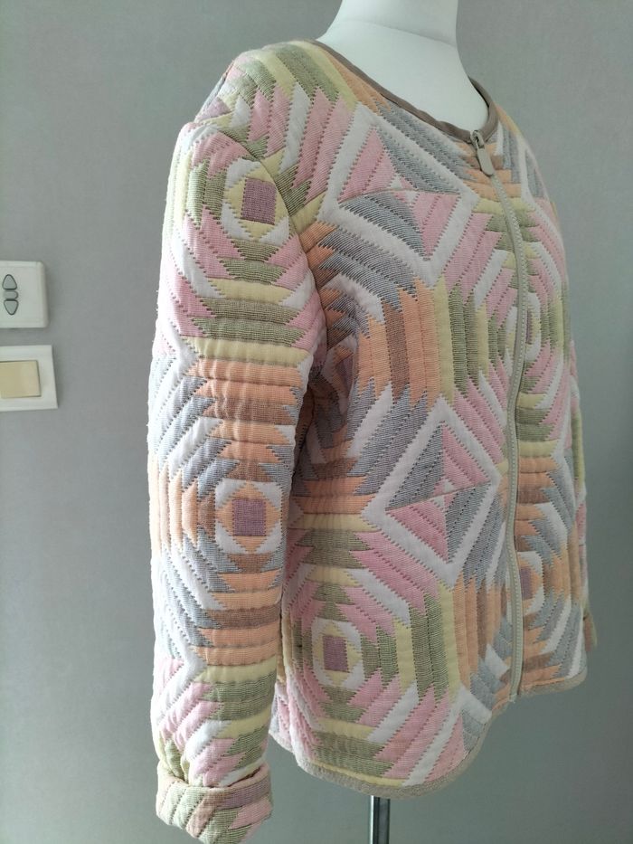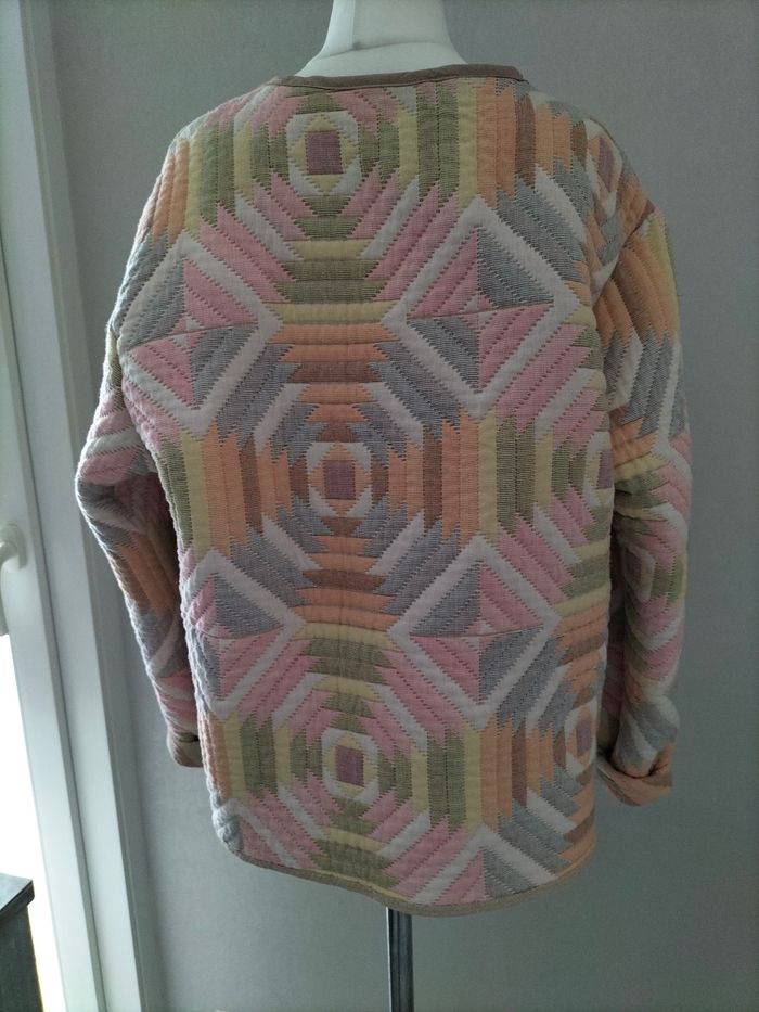 Veste matelassée upcyclée à partir d'un boutis en coton Très bon état Hauteur 62 cm environ Largeur aisselles à aisselles 53 cm environ Manches depuis le col : 73 cm environ, possibilité de les replier vers l'intérieur Manches depuis l'emmanchure 61 cm environ Peut convenir à une taille 36 ⚠️ Autres vêtements dans mon dressing #handmade #faitmain #upcycling #vintage #upcycled #vestematelasseefemme