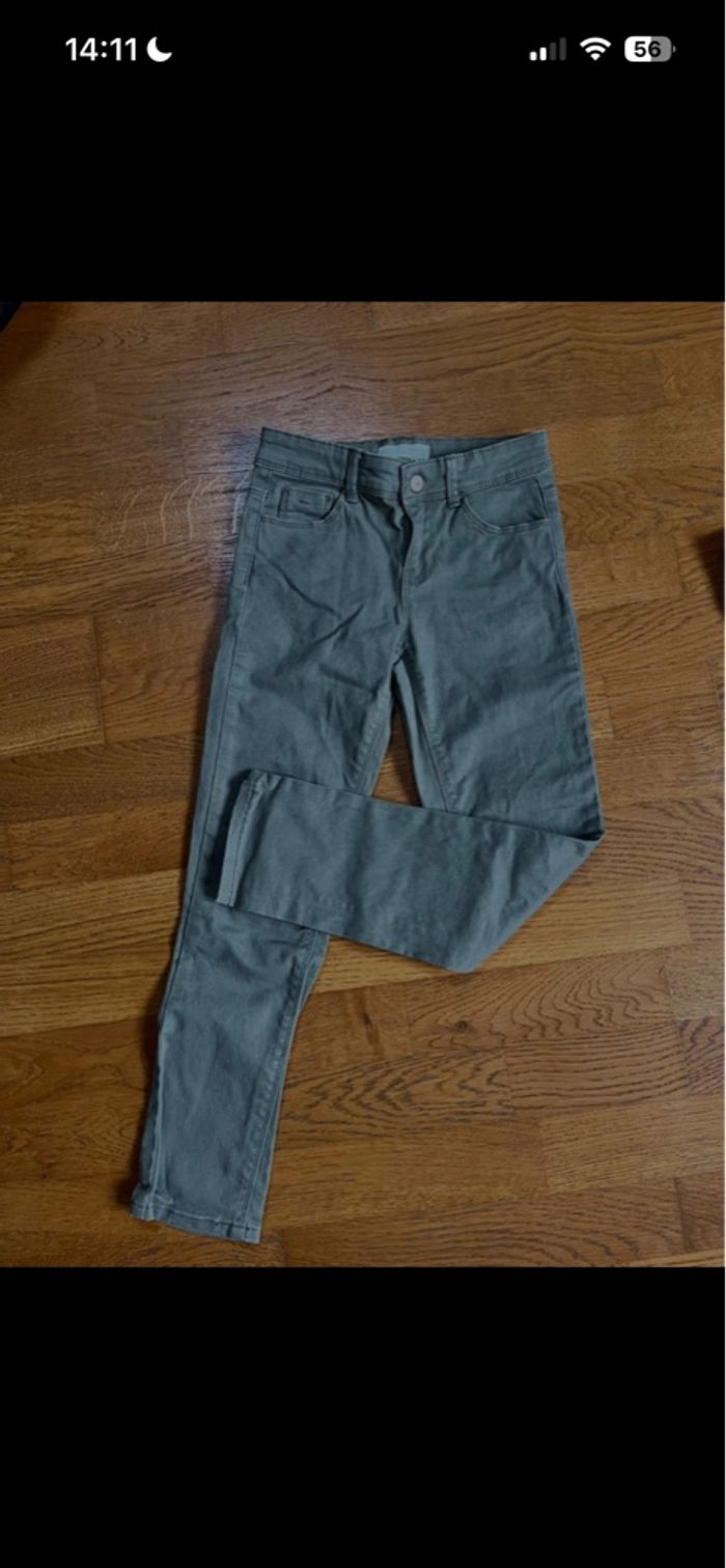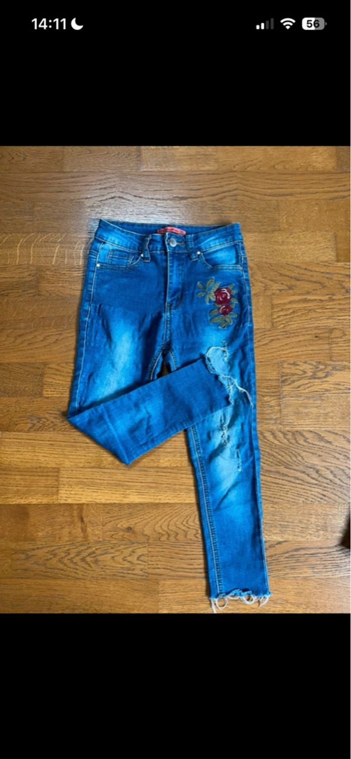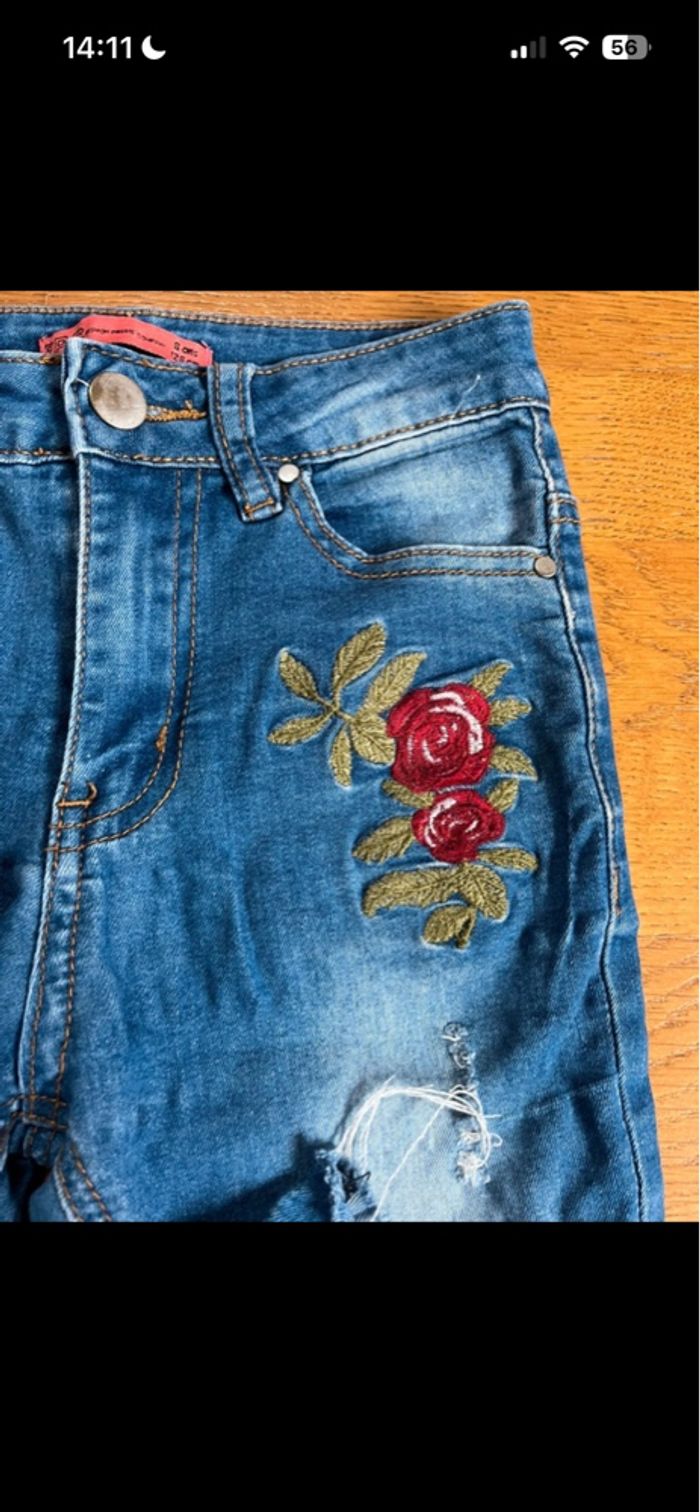 Le jean vert kaki et celui avec les fermetures sont réglables à la taille . Le jean avec une rose a de toutes petites taches au niveau du genou . Et il y a une petite robe en jean . Les marques sont kiabi et fashion private company