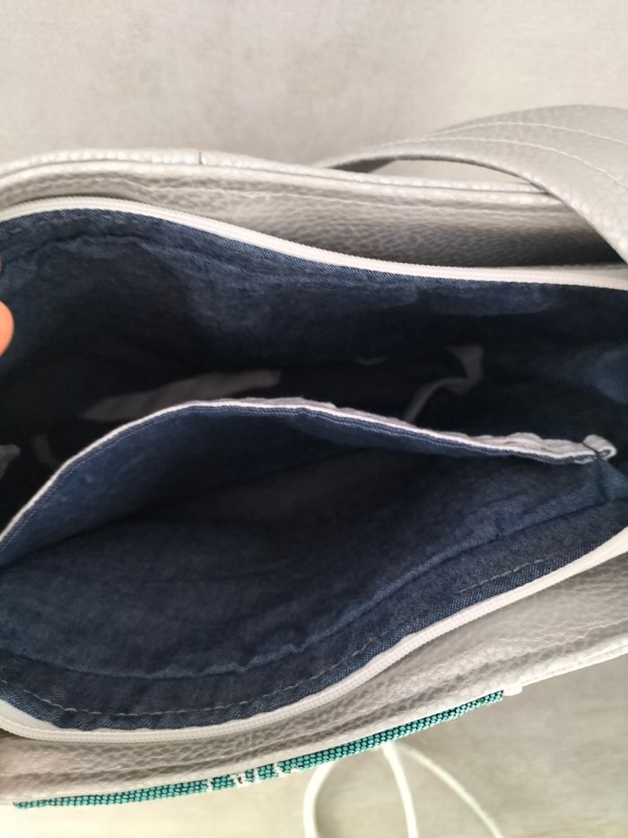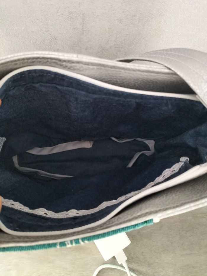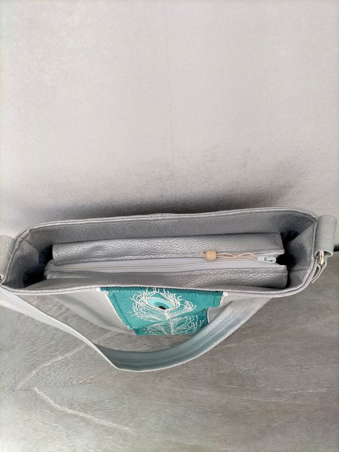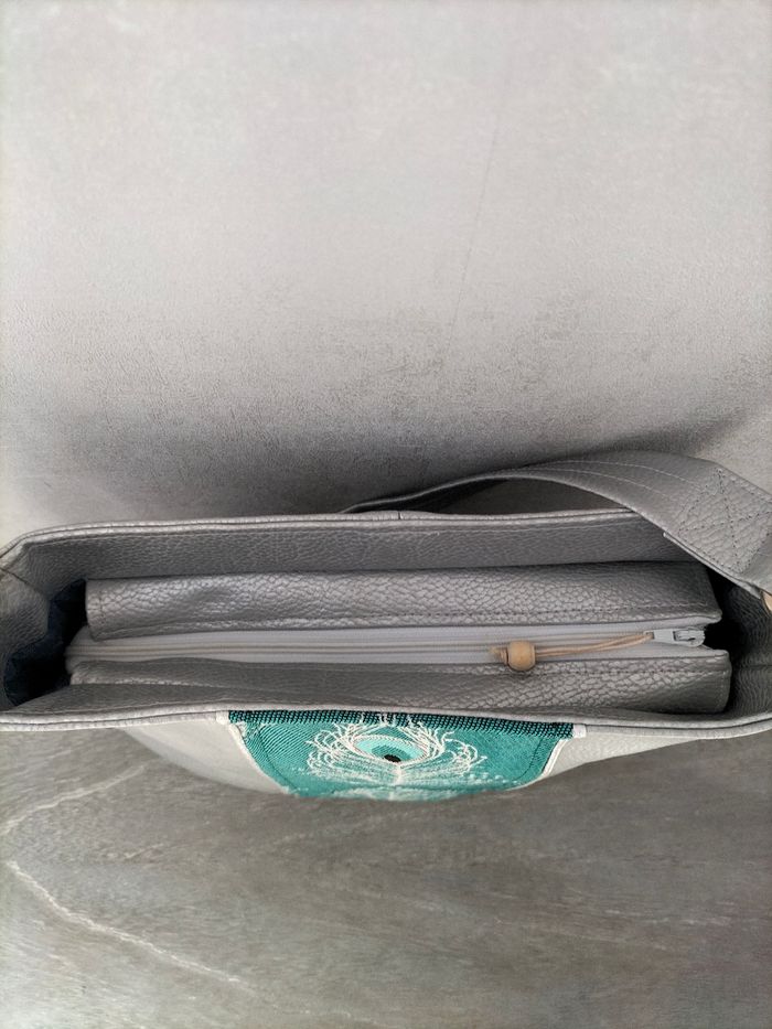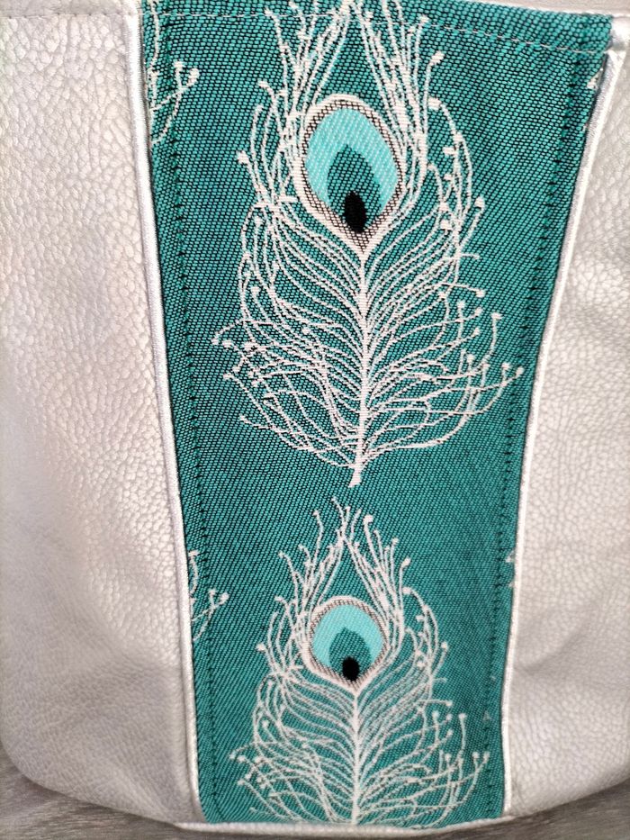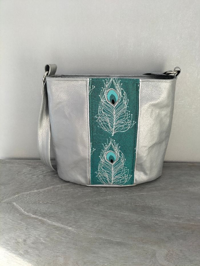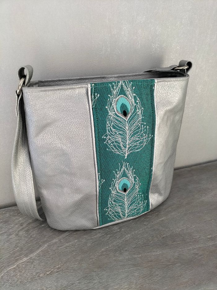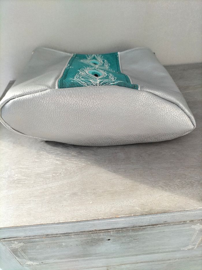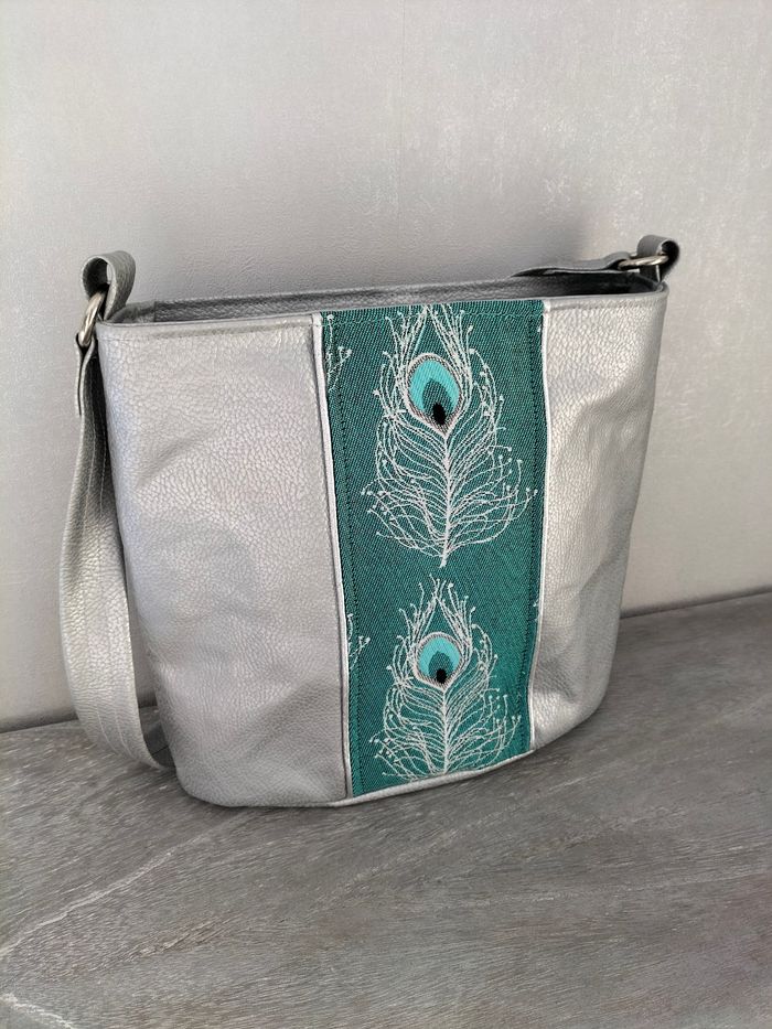 Sac en similicuir argent orné d'une bande de tissu représentant des plumes de paon. Le simili cuir a un aspect froissé Sac très léger H24xl30x9 cm environ Bandoulière 66 cm porté épaule