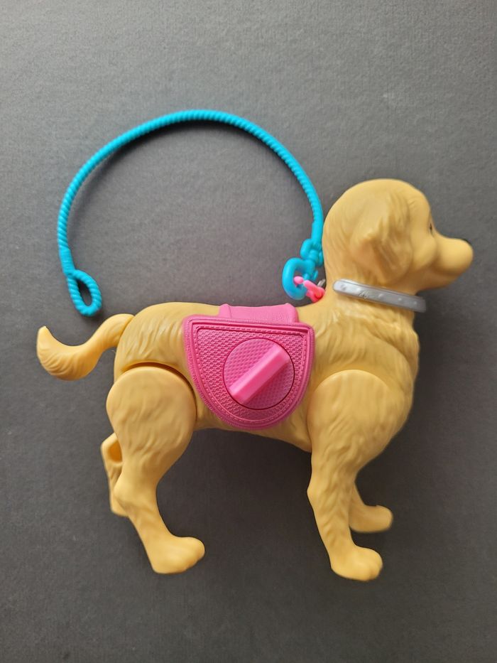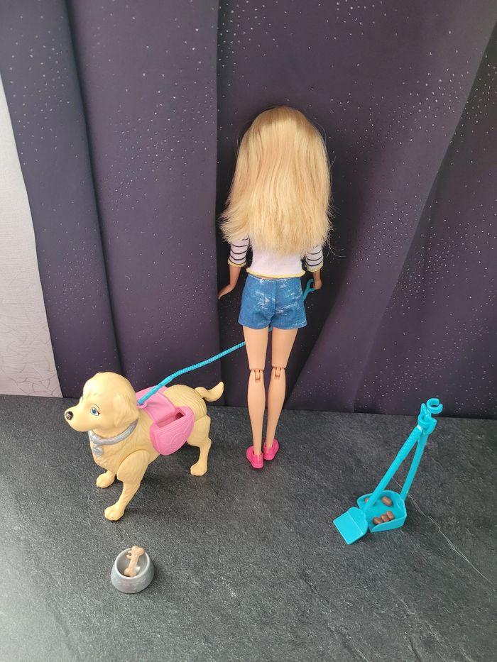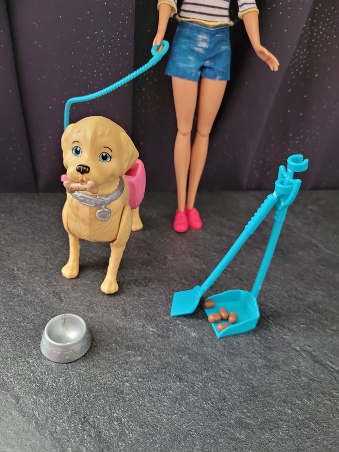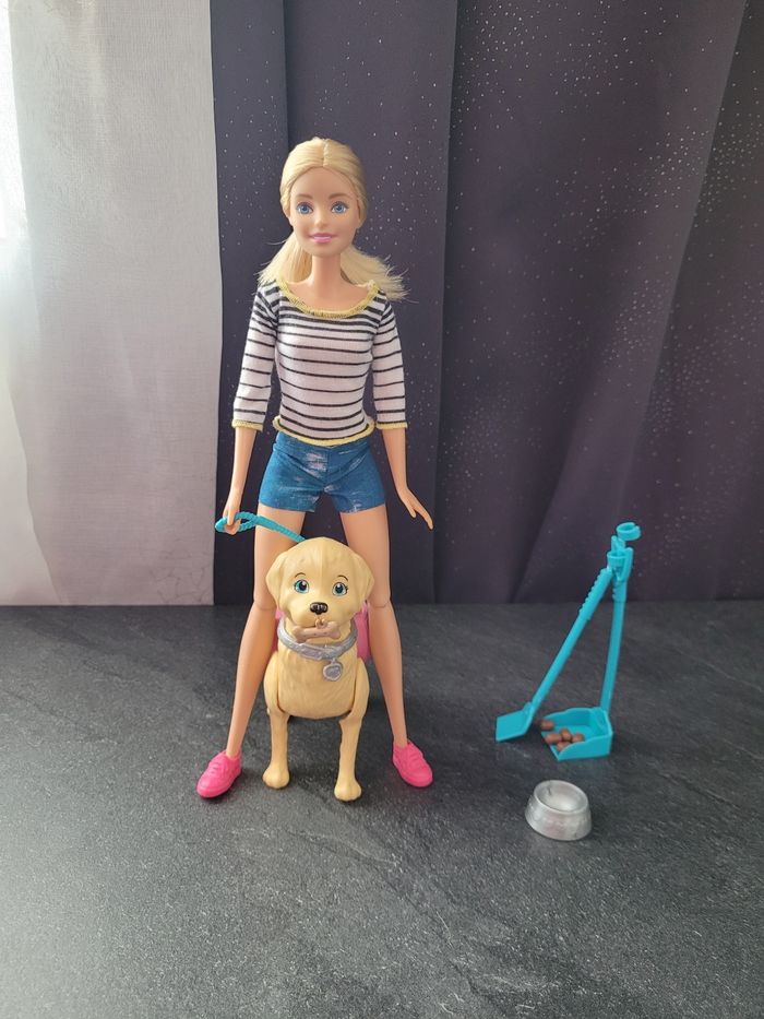 Je vends ce lot Barbie, complet comprenant : • 1 poupée Barbie en très bon état, • 1 chien avec laisse et sac rose • Des accessoires : laisse, ramasse-crottes, 5 crottes et gamelle avec os ⚠️ À noter : le chien ne marche plus tout seul (car le bouton rose rotatif ne marche plus, voir photo). Il reste cependant en bon état esthétique et peut toujours servir pour jouer. Tout est nettoyé. Dès 3 ans. Pour information : Mettre les 5 crottes dans le sac rose du chien. Lorsque il s’arrête pour faire ses besoins, appuie sur sa queue, puis nettoie avec la pelle et la balayette. Les accessoires tiennent dans la main ou le poignée de la poupée Barbie qui adore s’occuper de son animal favori. N’oublie pas de récompenser le chien lorsqu’il est sage avec une gamelle et un os qui tient aussi dans la gueule du chien!