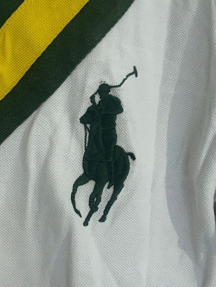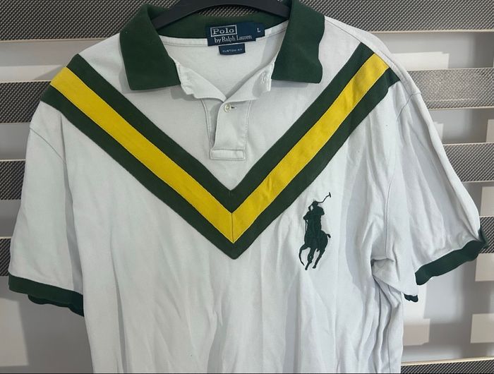 Je vends un polo, de la marque « Ralph Lauren », taille L - Dimensions: Longueur 65 cm - Largeur 45 cm - Matière: 100% Coton Numéro de série: 47471 170767 - Couleur: Blanc, Vert & Jaune En très bon état 9,99€