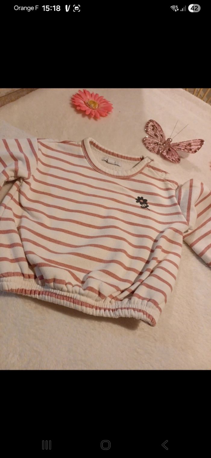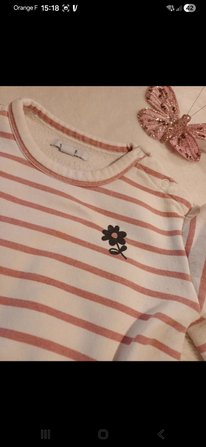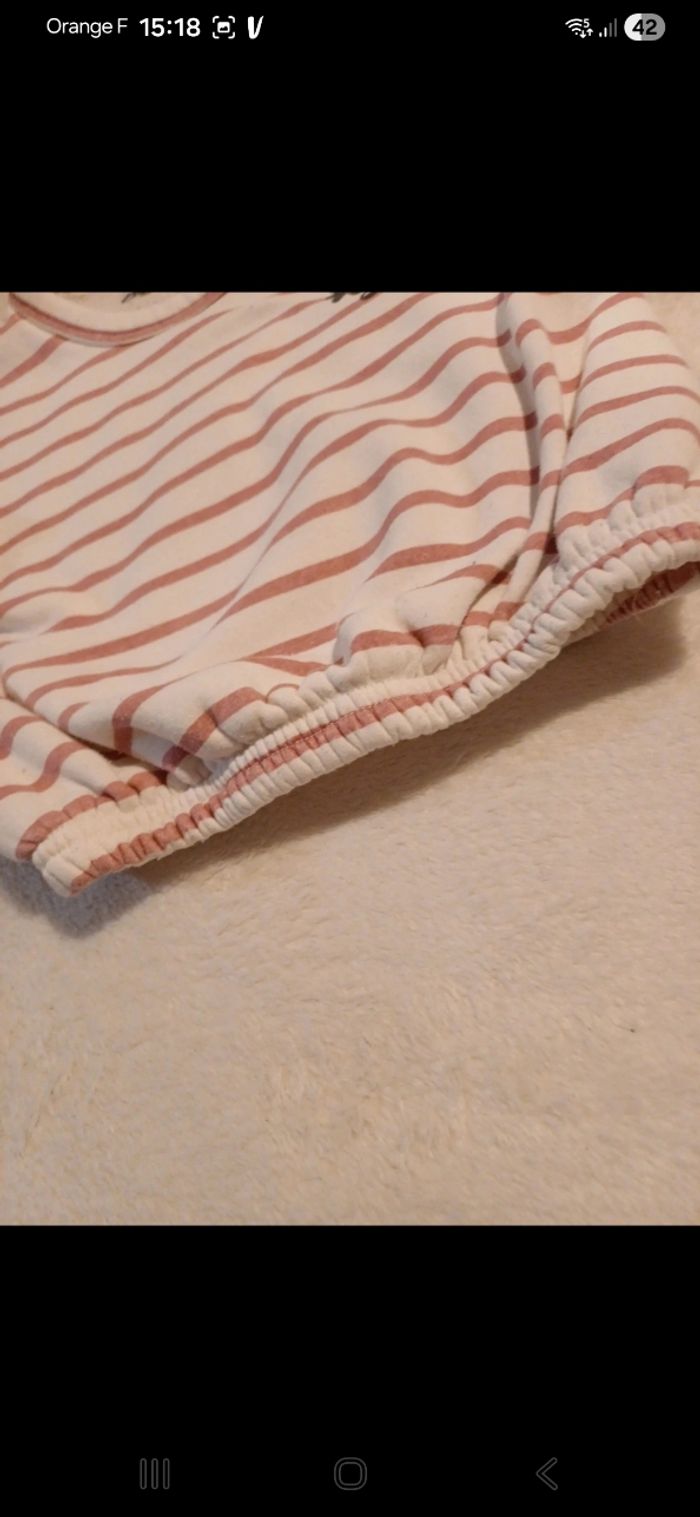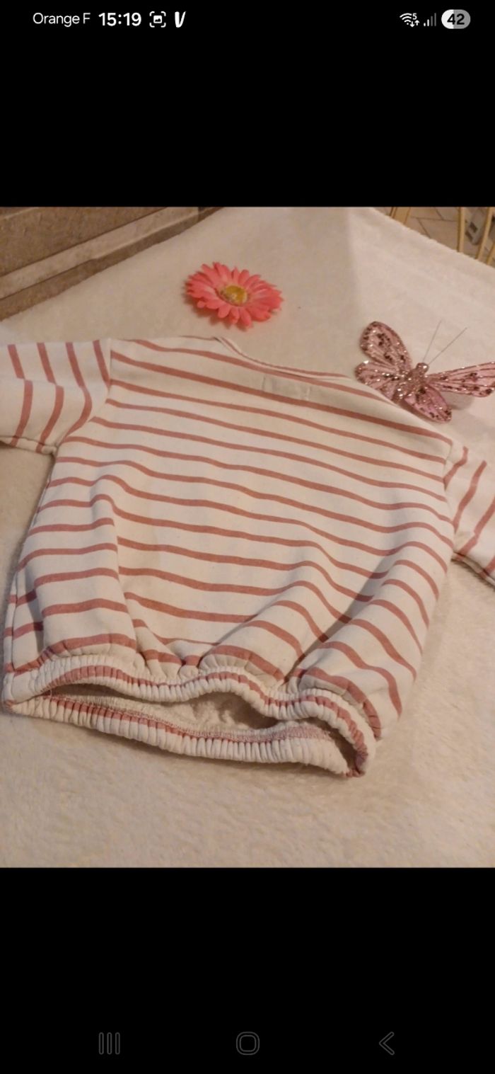 Sweat à col rond avec pressions à l encolure. Elastiqué à la taille. Bouloché à certains endroits