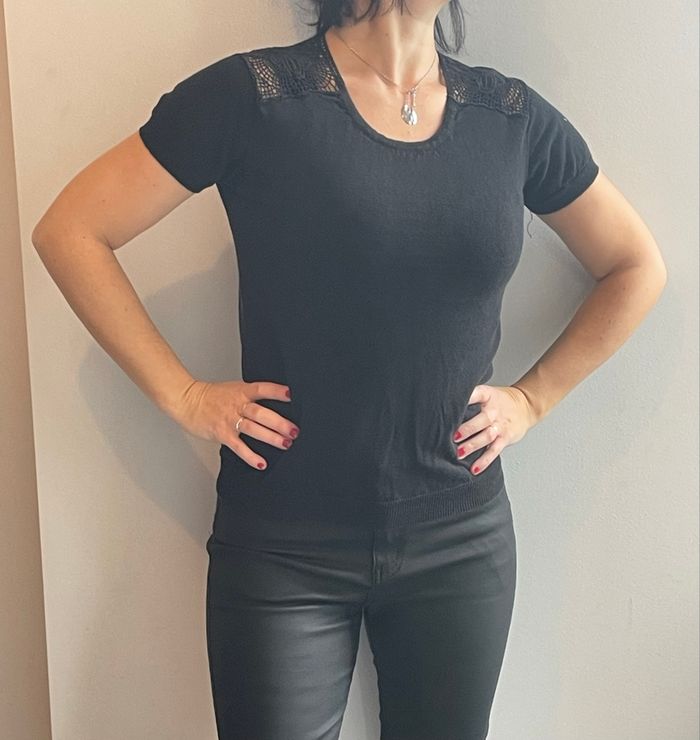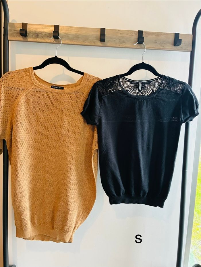 Lot tunique et pull manches courtes mi saison pour femme : * Joli haut / top manches 3/4 Haut beige et fil doré (ne se voit pas sur la photo) Peut être porté court (comme sur la photo 1) ou plus long (photo 3) Manches 3/4 Marque Mango Taille S * Joli petit pull léger mi saison Manches courtes Effet Dentelles sur les épaules et l’arrière En laine légère Naf naf taille S #stefetjuju51femme3638 maison non fumeurs bien d’autres choses dans mon dressing de nouveaux articles très régulièrement nombreux # dans mon profil pour faciliter vos recherches merci pour votre visite et belle journée ☺️ #haut #top #teeshirt #transparent #manches3/4 #doré #dentelle #pull