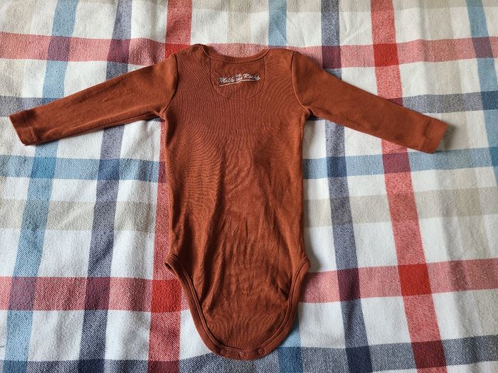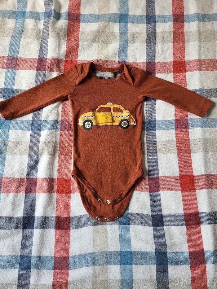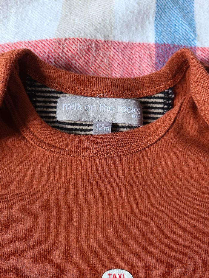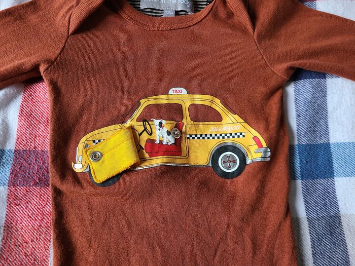 Joli body manches longues Milk on the Rocks nyc marron à motif taxi newyorkais original. Marque brodée au dos. Encolure américaine. Motif amusant avec bouton pression sur le devant. Made in Portugal. 100 % coton. Excellente qualité. Porté 2 fois. Taille 12 mois.
