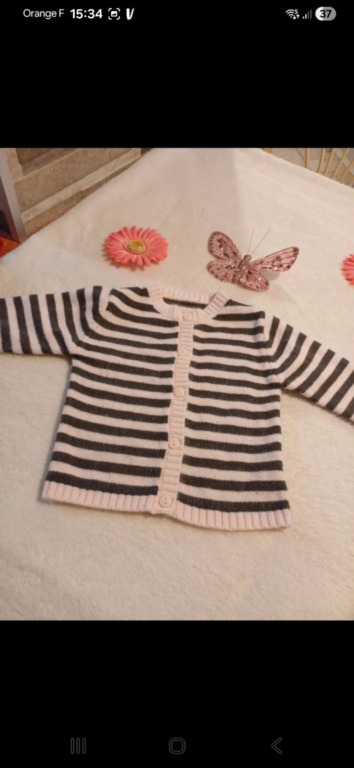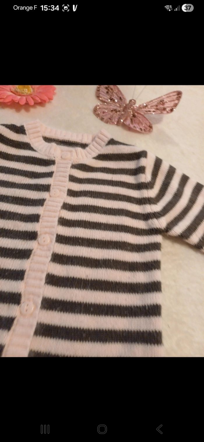 Gilet à rayures, boutonné à l avant. Noté 6 mois mais taille grand. Bouloché