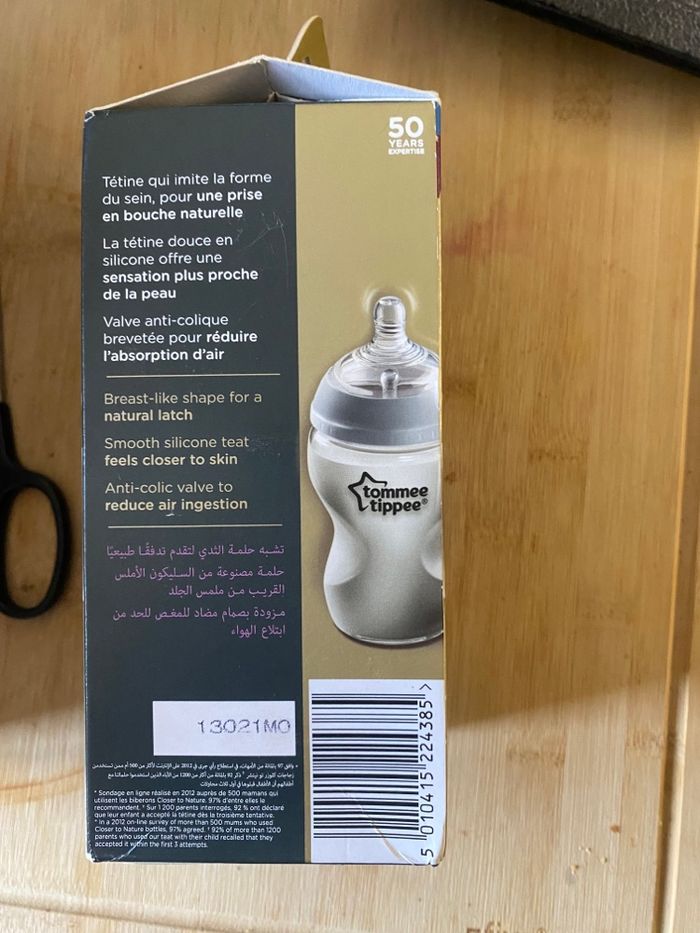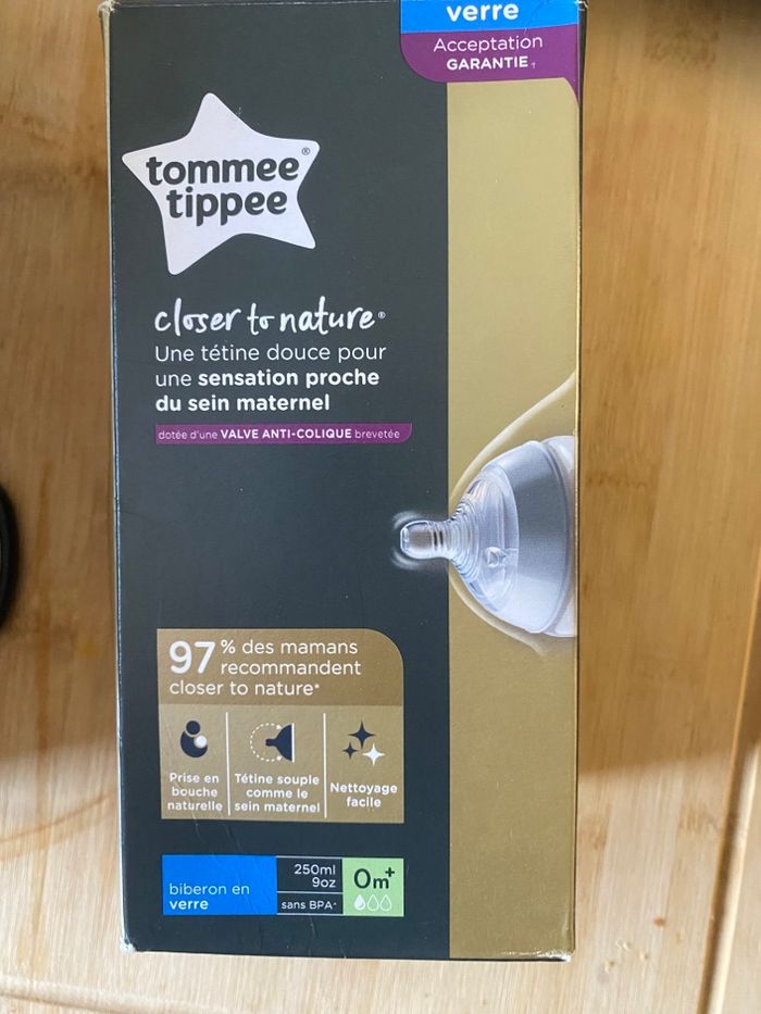Biberon de marque tommee tippee en verre, contenance 250 ml convient au bébé 0m+. Sans BPA, valve anti-colique. Sensation proche du sein maternel. Neuf.