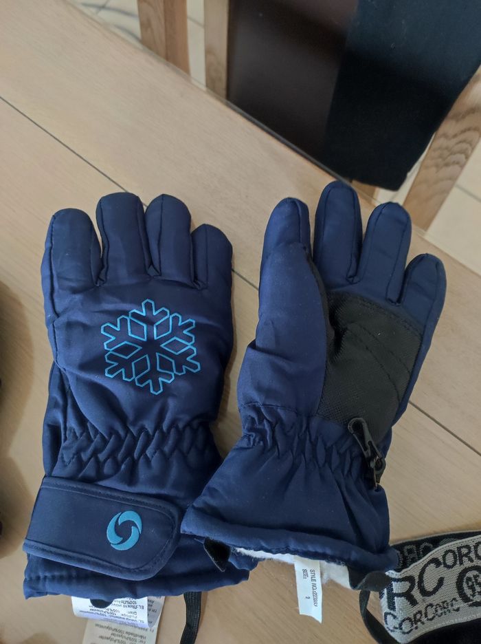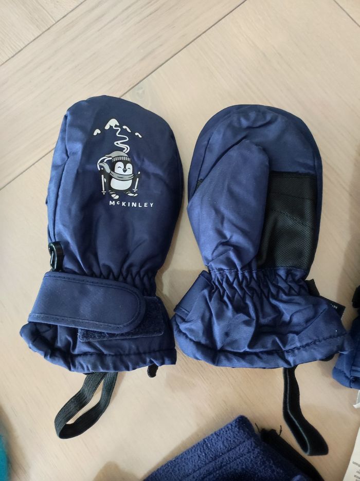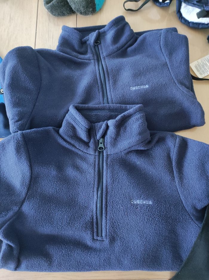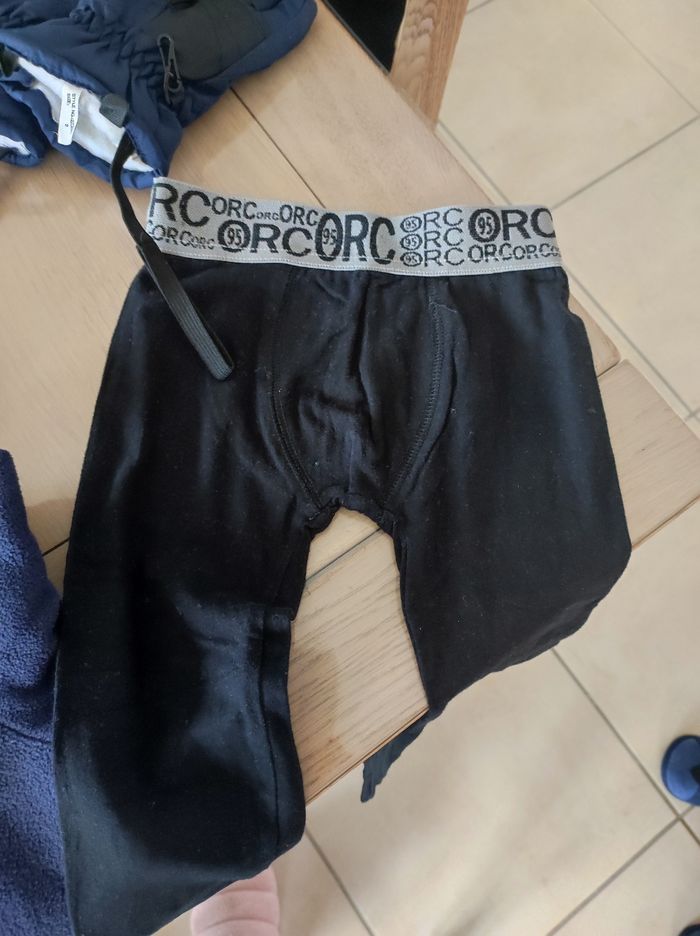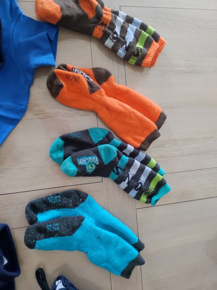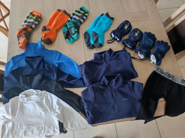 Lot vêtements de ski comprenant: - 4 paires de chaussettes 24/26 (Polochon) - 1 paire de moufle taille 2 (Mc kinley) - 1 paire de gant taille 2 (Etirel) - 4 sous-pulls en 4 ans (Orchestra) - 2 polaires en 4/5 ans (Quechua) - 1 leggings 4 ans (Orchestra)