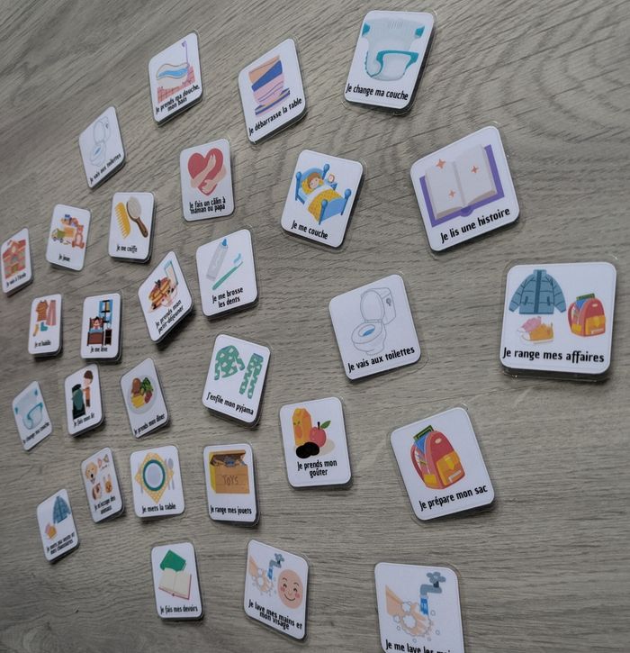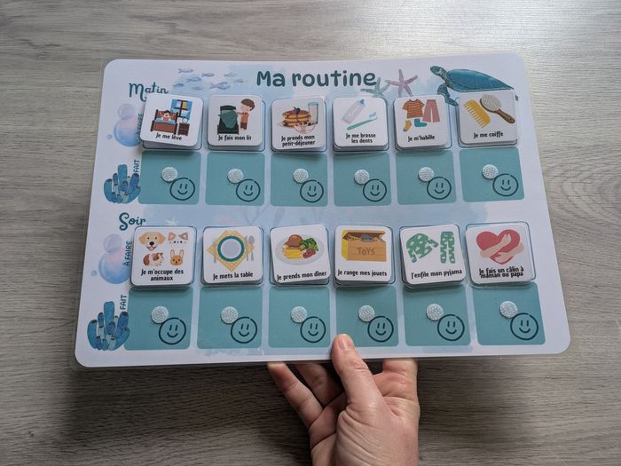 Aidez votre enfant à organiser sa journée avec plaisir et autonomie. Ce tableau tout en douceur sur les animaux marins transforme la routine en jeu clair et motivant, tout en développant confiance, repères et responsabilité. ❓Pourquoi adopter une routine 🔸Favorise l’autonomie et la responsabilisation 🔸Réduit le stress et les conflits liés aux transitions 🔸Développe la confiance en soi grâce à un suivi visuel 🔸Permet aux parents de gagner du temps et de la sérénité 🔸Idéal pour l'école ✅Contenu 🔸 1 tableau A4 tortue et autres animaux de mer 🔸30 vignettes à scratch pour chaque étape : toilette, repas, jeux, école, douche... 📋Caractéristiques techniques 🔸Dimension du tableau: A4 🔸Taille des vignettes: environ 4x4cm 🔸Papier 200 g/m² (routine) / 160g/m² (vignettes) 🔸Plastification 125x2 microns 🔸Scratchs 10 mm 📝 Liste des vignettes incluses: Je mets ma veste et mes chaussures Je vais aux toilettes X2 Je lave les mains et mon visage Je me brosse les dents x2 Je prends ma douche, mon bain Je me coiffe Je m'habille Je prends mon petit déjeuner Je me lève J'enfile mon pyjama Je fais un câlin à maman ou papa Je me couche Je change ma couche X2 Je prends mon dîner Je me lave les mains Je range mes jouets Je m'occupe des animaux Je fais mon lit Je lis une histoire Je débarrasse la table Je joue Je prépare mon sac Je range mes affaires Je vais à l'école Je prends mon goûter Je mets la table Je fais mes devoirs 🧷Système d'attache mural non inclus 🌈Un support durable et réutilisable d'inspiration Montessori, qui accompagne votre enfant dans toutes ses activités 📬 Envoi rapide et soigné N'hésitez pas à me contacter pour plus de renseignements ☺️