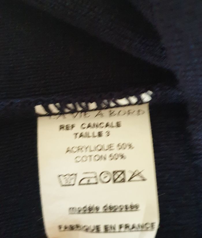 Joli pull marin, à manches longues, en très bon état. Marque : La Vie à Bord Référence : Cancale Taille : T3 Fabriqué en France 50% acrylique – 50 % coton Les mesures prises à plat sont données à titre indicatif et peuvent varier de quelques millimètres. - Largeur d’emmanchure : 52 cm - Hauteur : 56 cm - Longueur de manche : dessus 55 cm – dessous 35 cm - Largeur bas : 49 cm - Poids : 315 g Envoi rapide et soigné.