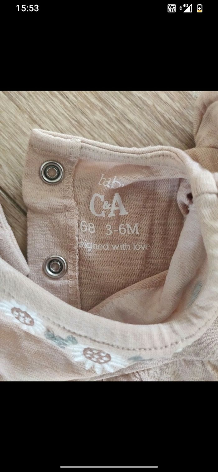 Ensemble léger fille composé d'un teeshirt, d'un caleçon court et d'un bandeau de marque C&A taille 3-6 mois en bon état.