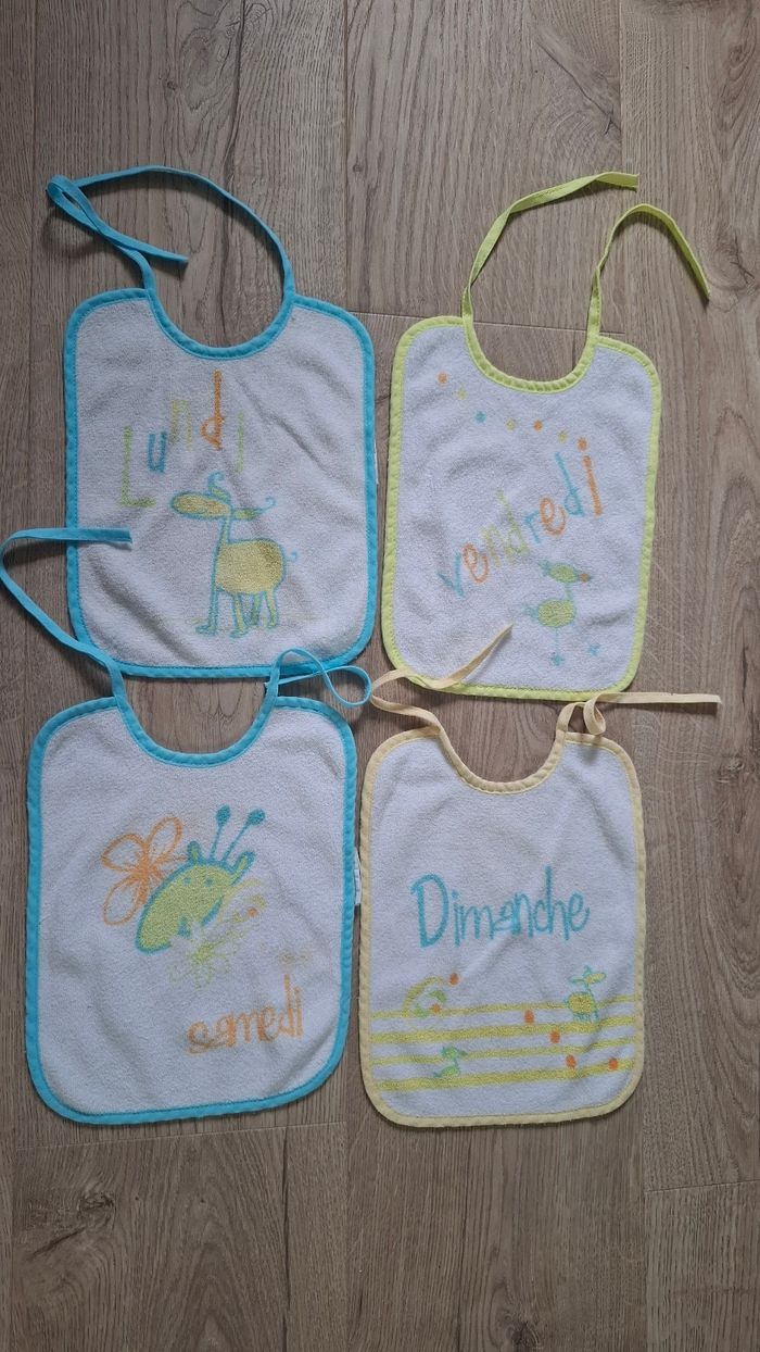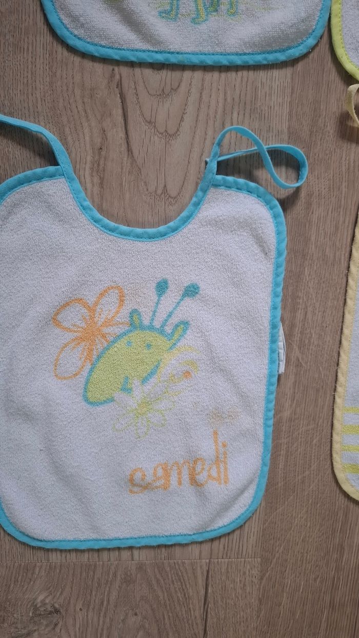#loluxiapuericulture 4 bavoirs : lundi / vendredi / samedi / dimanche de marque BabyCalin A cordon pour nouer dans le cou A noter : tâches sur "Samedi"